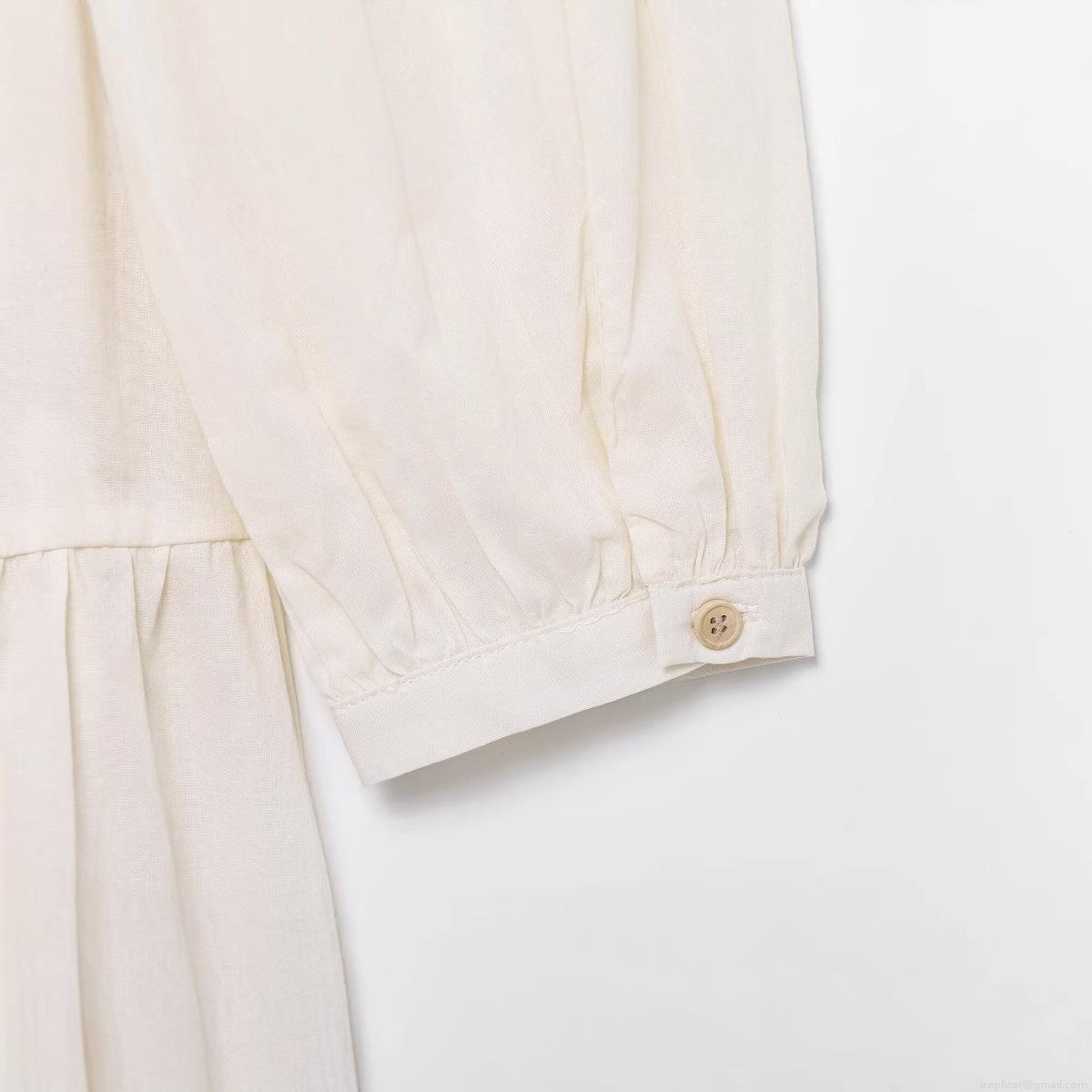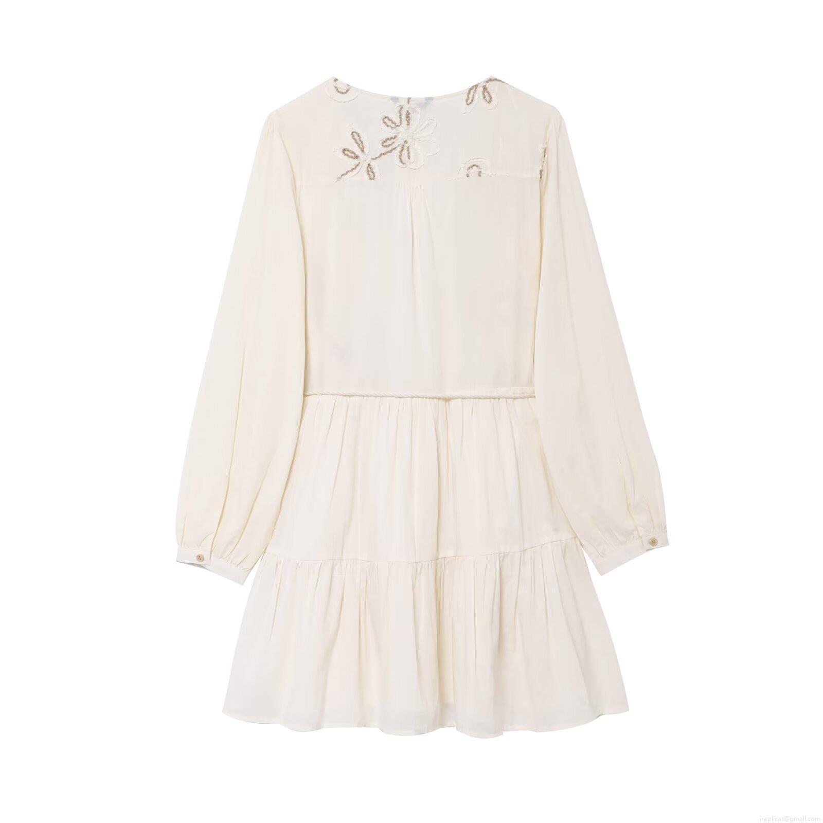 • Elegant V-Neck Embroidered Long Sleeve Mini Dress For Women Bohemian Tiered Ruffle Hem Cotton Polyester Blend Dress With Wooden Buttons And Tassel Belt
