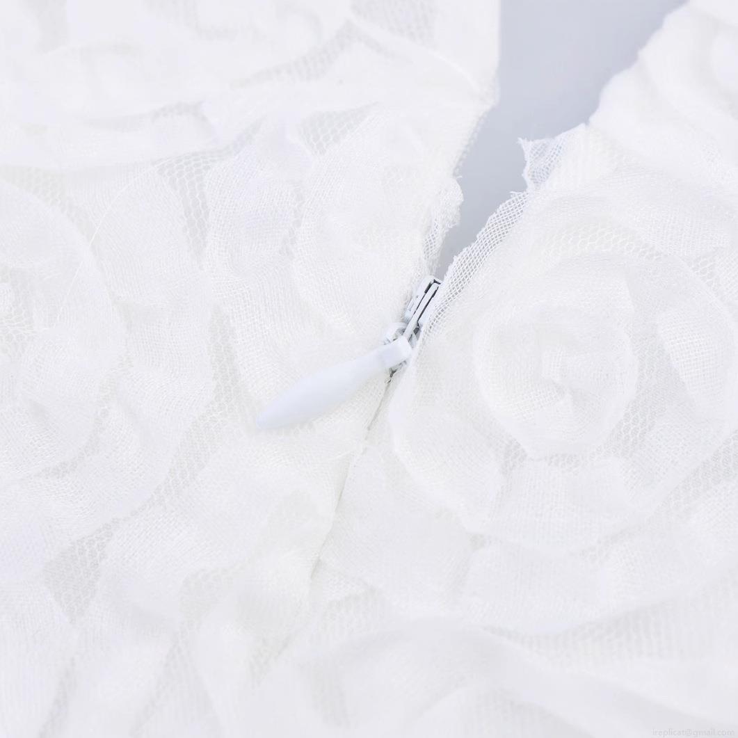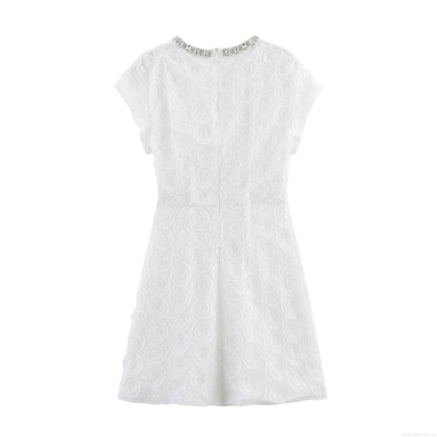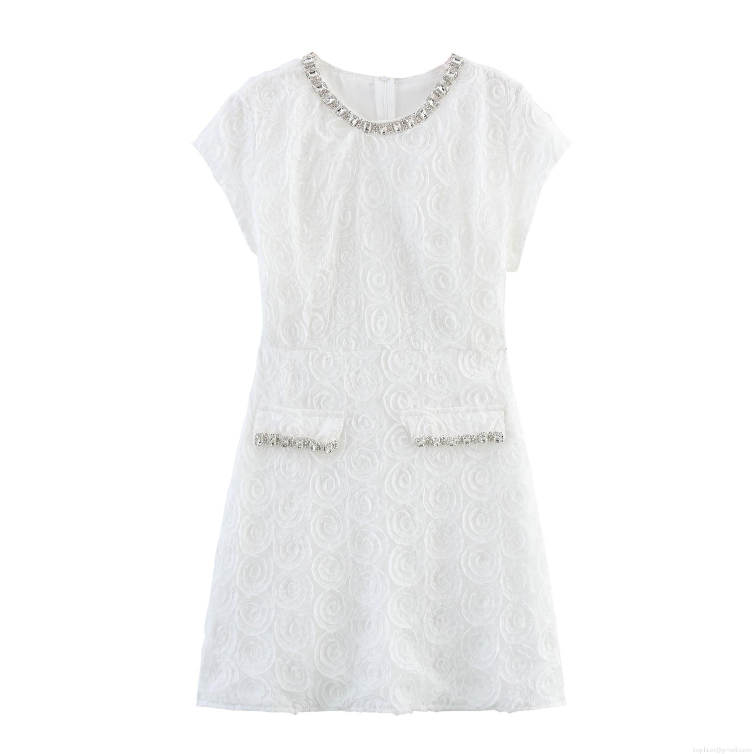 • Elegant White Bodycon Mini Dress With 3D Rose Flower Texture Rhinestone Chain Round Neck Short Sleeve French Style Party Dress For Women