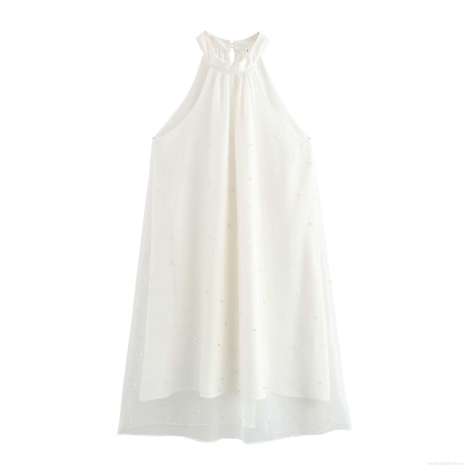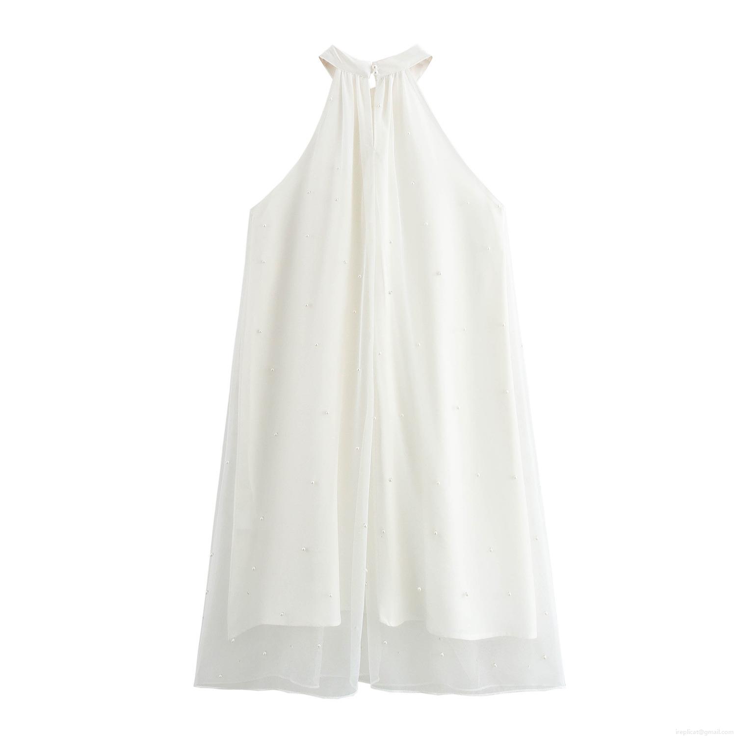 Elegant White Halter Mini Dress With Pearl Mesh Overlay Sleeveless A-Line Double Layer Party Dress For Women Socialite Style Chic Short Dress