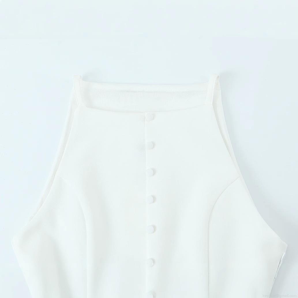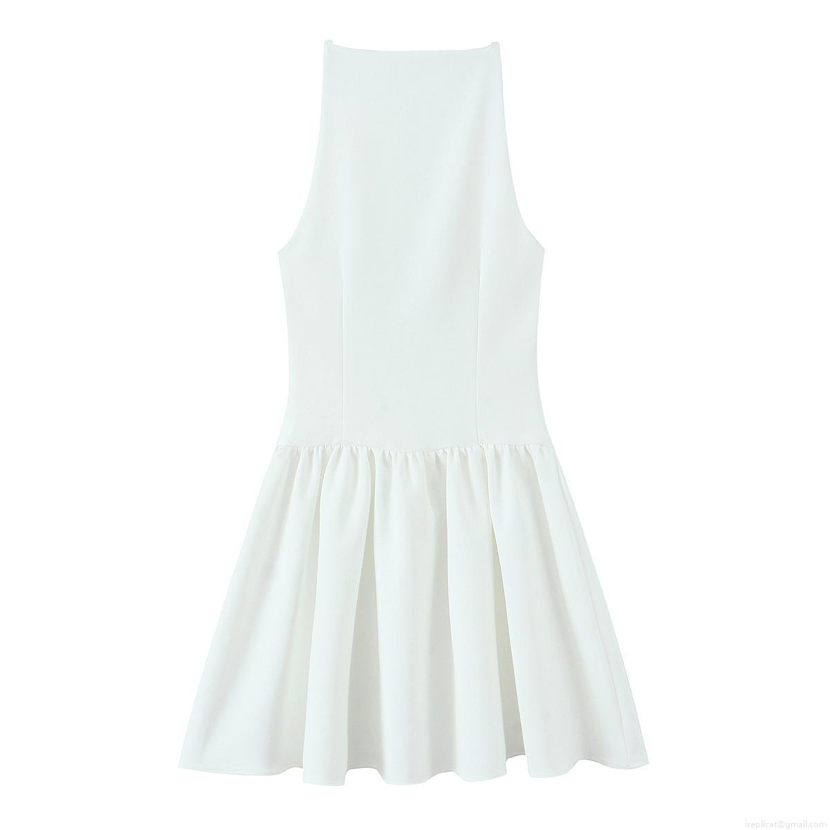 • Elegant White Halter Neck Sleeveless Mini Dress With Button Decoration And Pleated Hem Summer Polyester Short Party Dress For Women