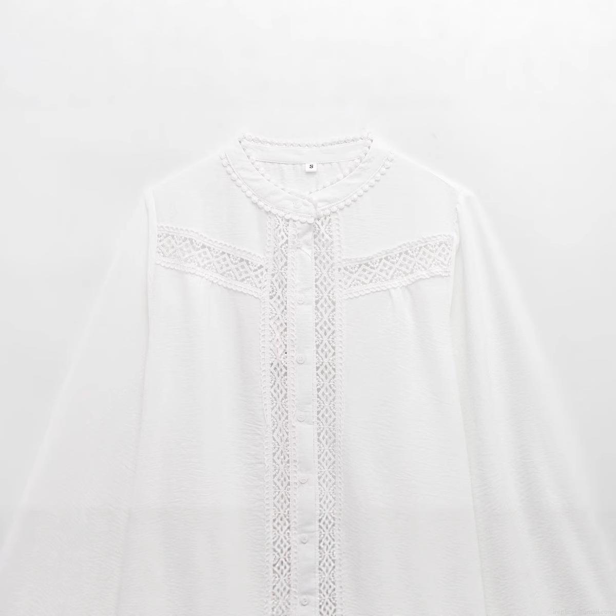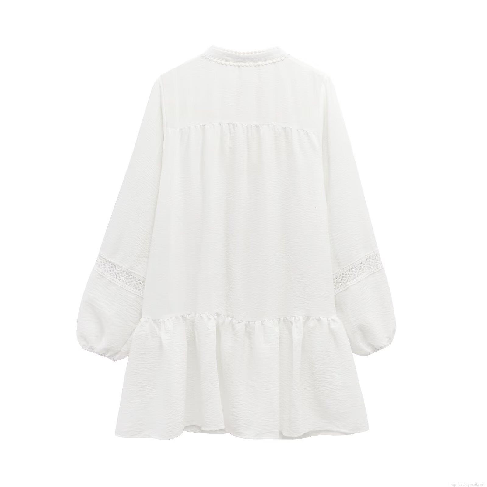 • Elegant White Lace Splicing Long Sleeve Mini Dress With Hollow Out Crochet Ruffled Hem Stand Collar For Women Party Wedding Evening Socialite Style