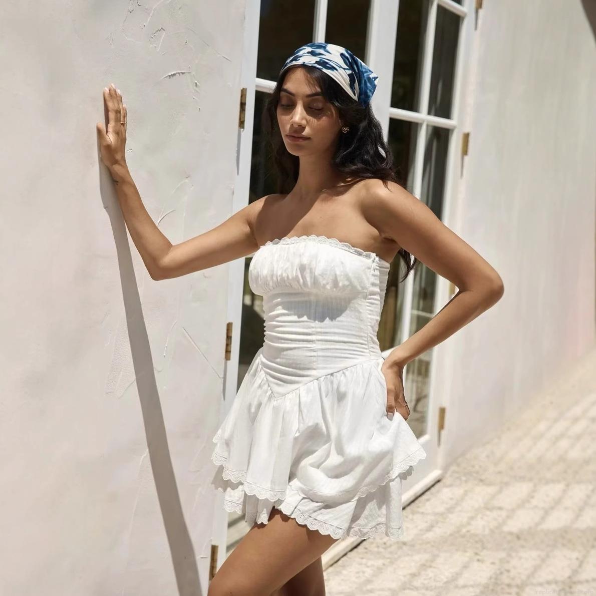 • Elegant White Lace Tube Top Mini Dress For Women Summer Vacation Party Sweet Tiered Smocked Bodycon A-Line Dress