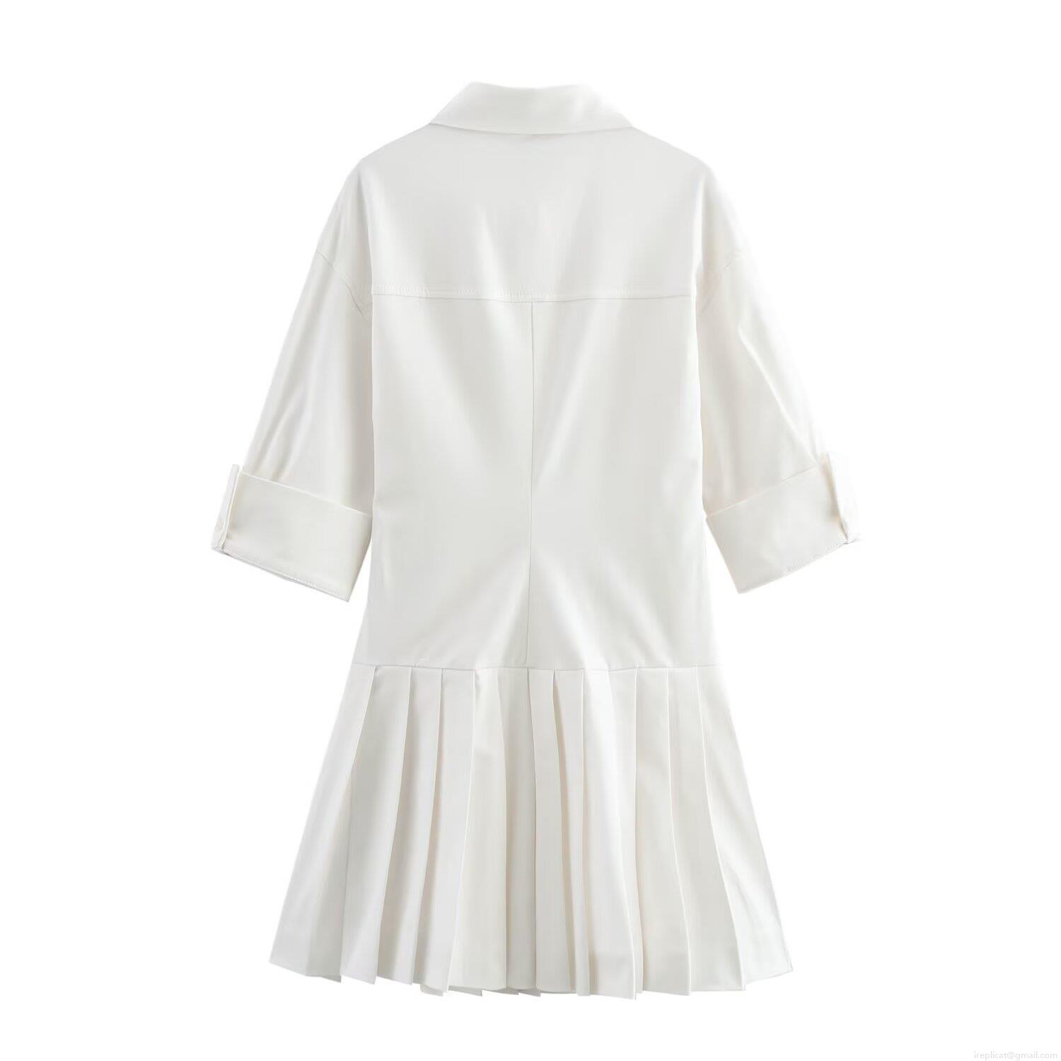 Elegant White Mini Shirt Dress Short Sleeve Pleated Hem Button Front Lapel Collar Polyester Blend Casual Fashion A-Line Dress for Women