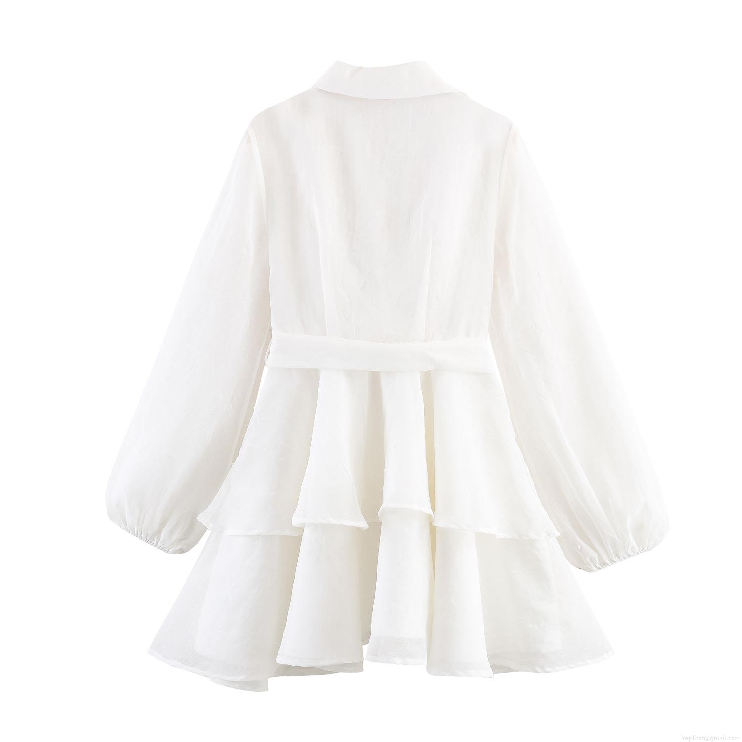 Elegant White Tiered Mini Dress Long Puff Sleeve Shirt Collar With Pearl Buckle Belt For Women Party Banquet Social Sexy Bodycon Clubwear Polyester Breathable Dress