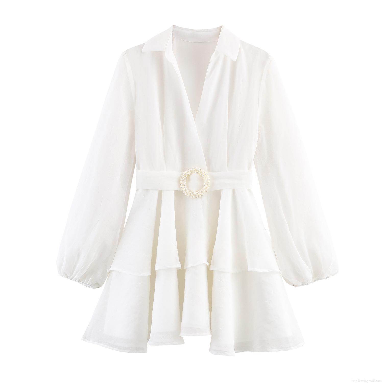 • Elegant White Tiered Mini Dress Long Puff Sleeve Shirt Collar With Pearl Buckle Belt For Women Party Banquet Social Sexy Bodycon Clubwear Polyester Breathable Dress