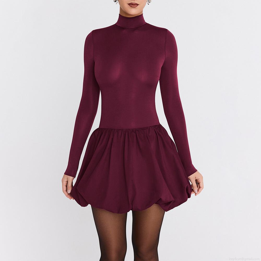 Elegant Wine Red Mock Neck Long Sleeve Mini Dress For Women Sexy Slim Fit High Waist Pleated A-Line Bodycon Cocktail Party Dresses