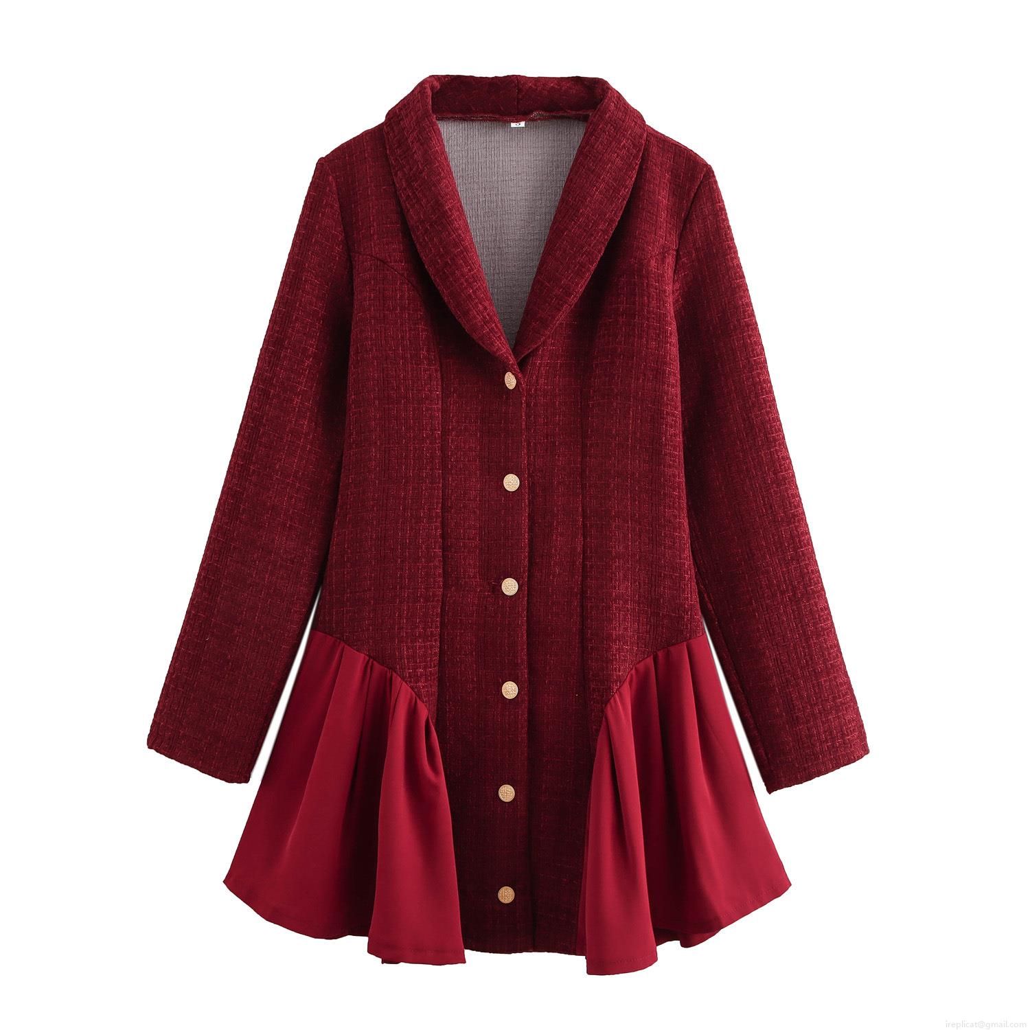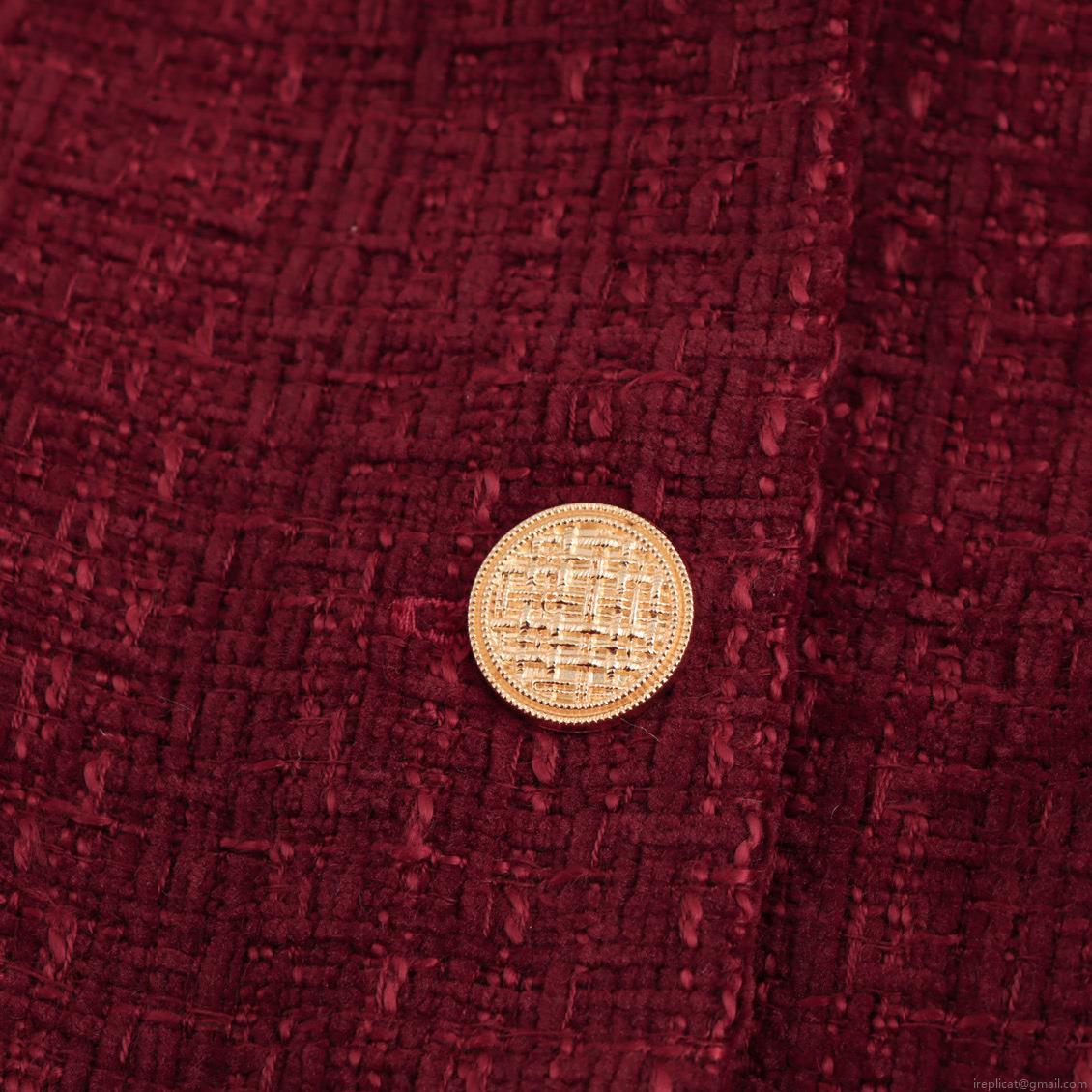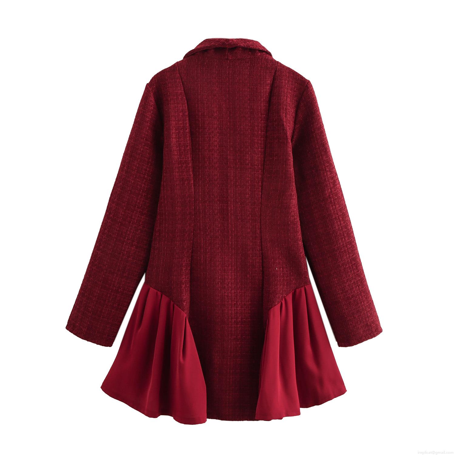• Elegant Wine Red Tweed V-Neck Spliced Ruffle Hem Mini Dress With Gold Buttons Long Sleeve Slim Fit Short Party Dress For Women