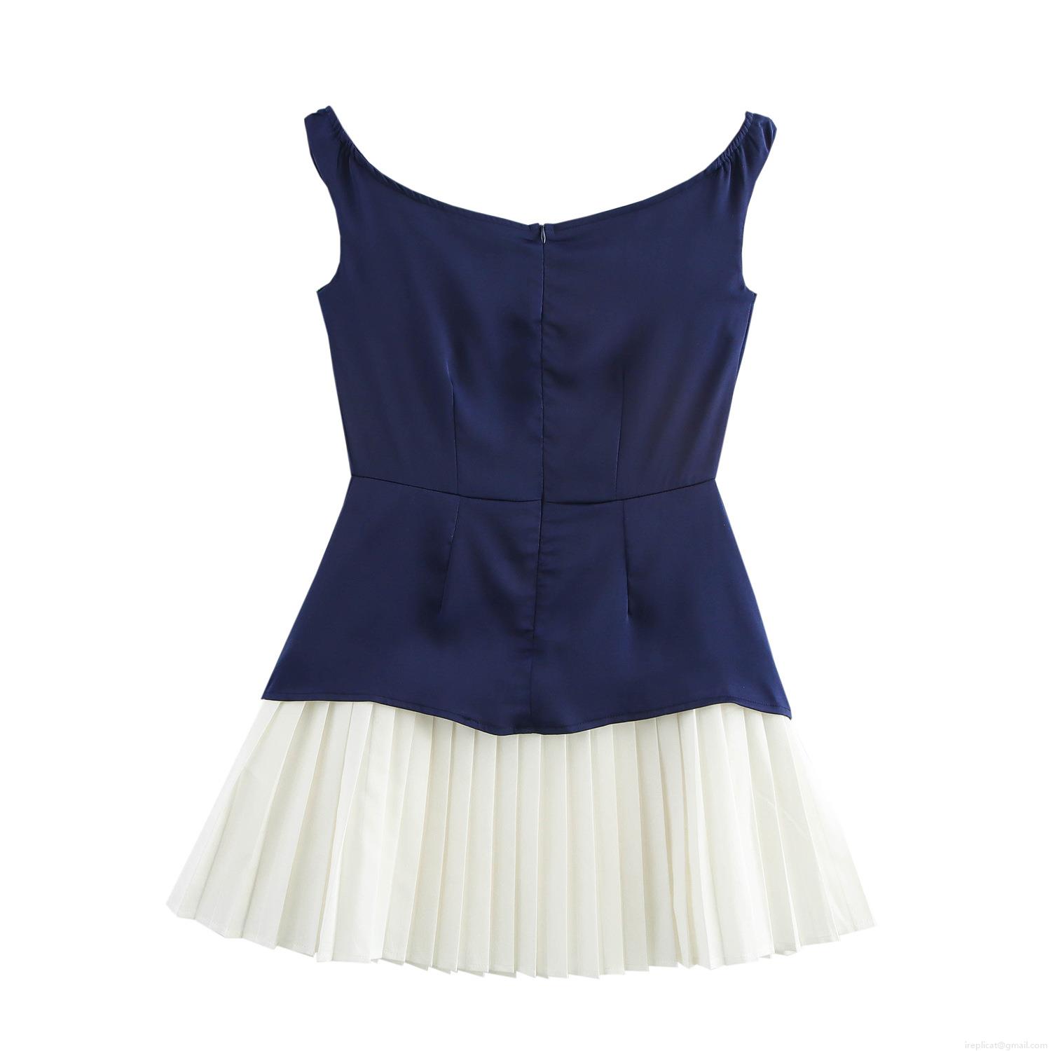 Elegant Women Contrast Color Off Shoulder Mini Dress Sleeveless Pleated Hem Bodycon Patchwork Short Skirt Intellectual Style Party Clubwear