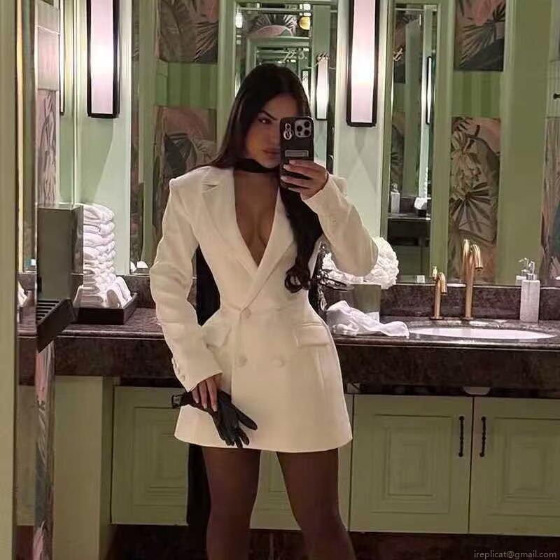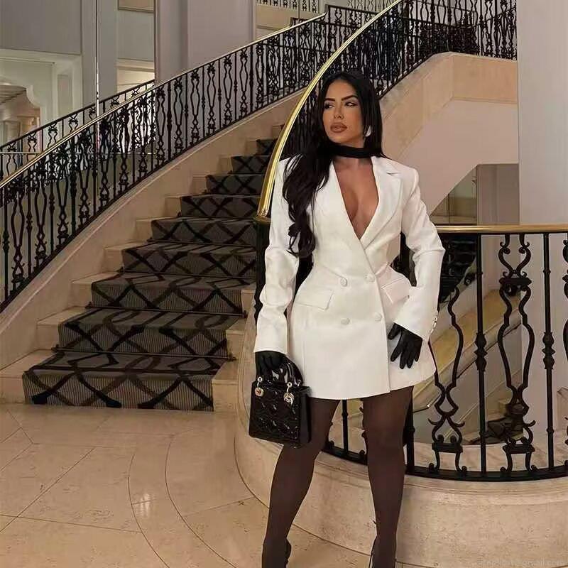 • Elegant Women Double Breasted Blazer Dress Sexy Deep V Neck Long Sleeve Cinched Waist Polyester Mini Suit Dress For Commute Party Office Lady