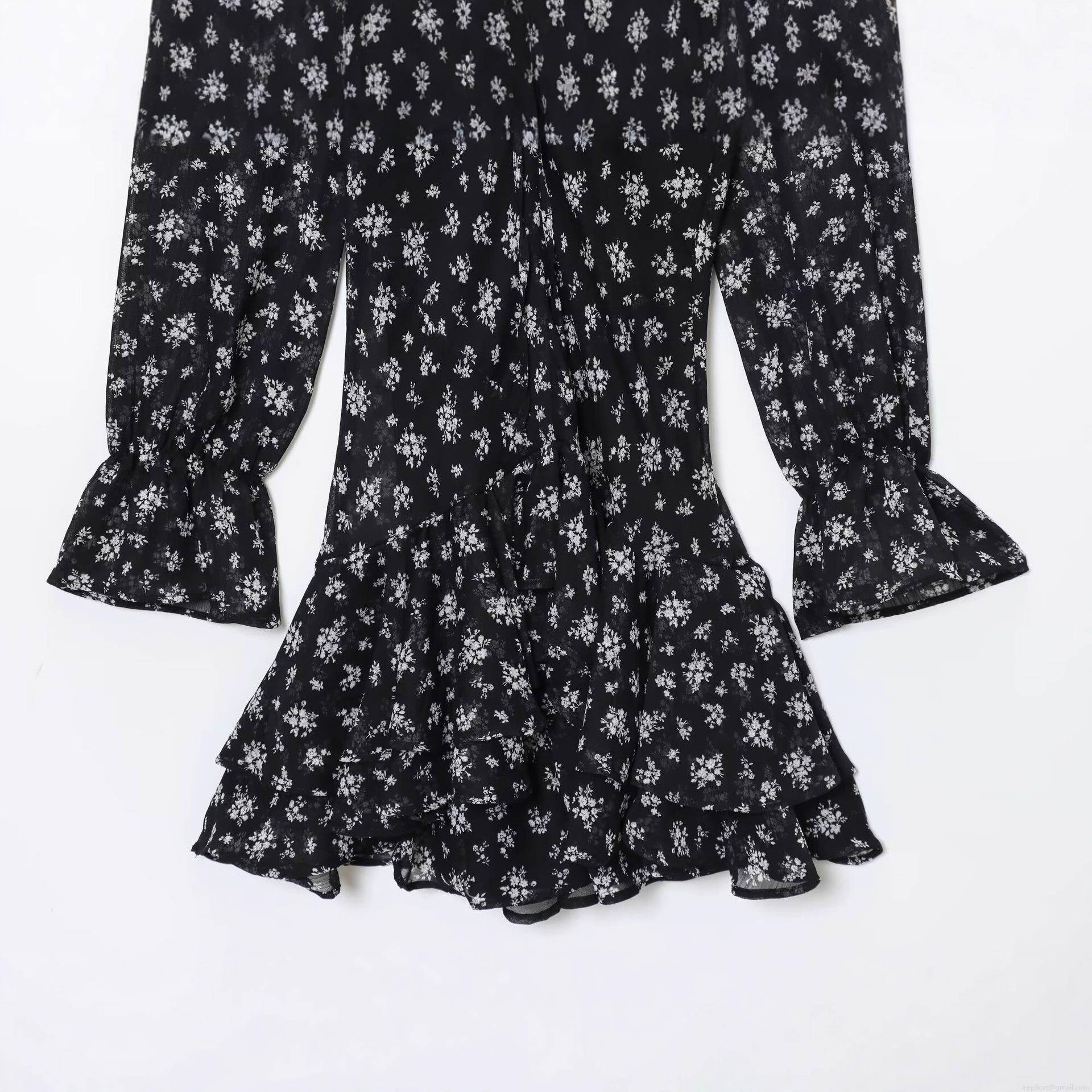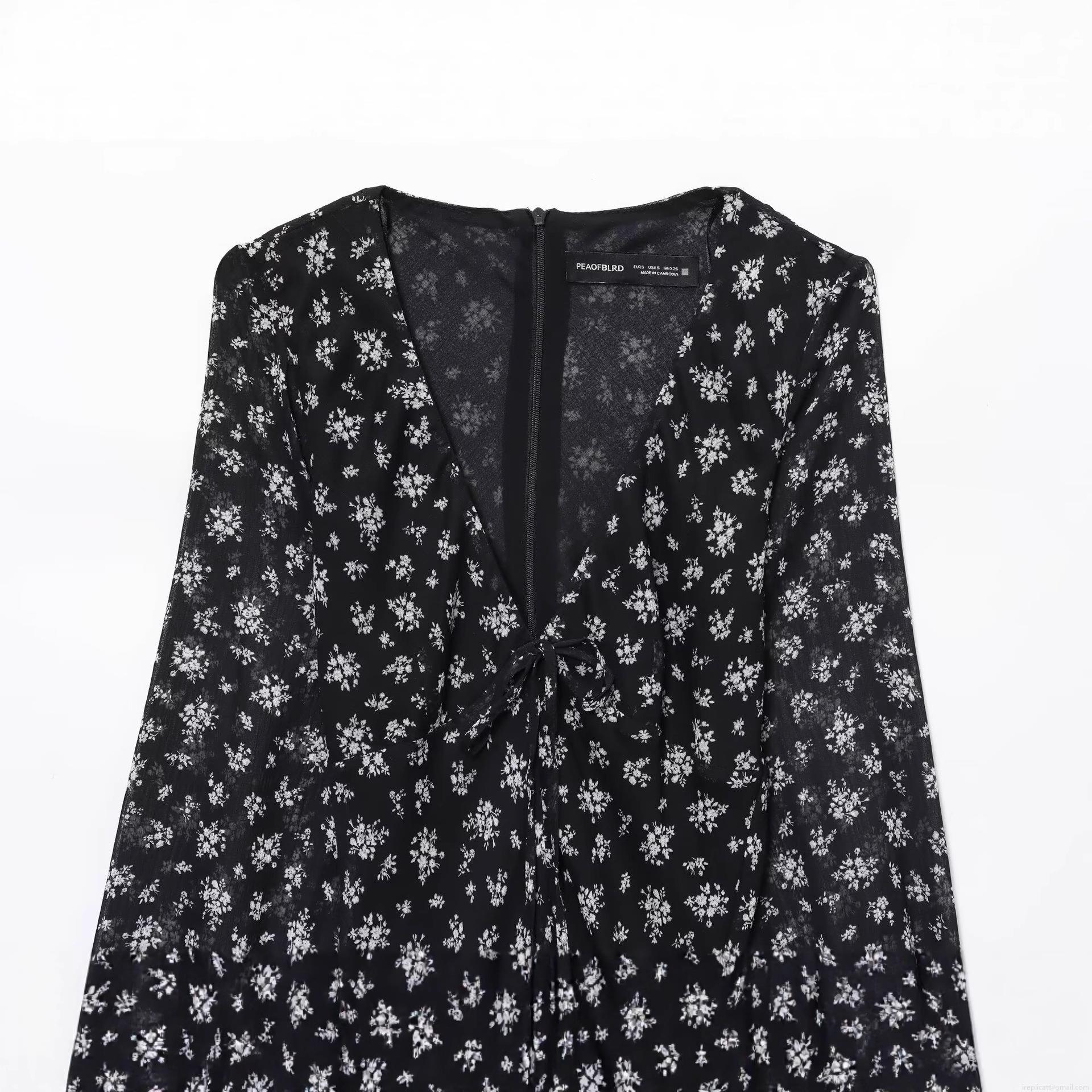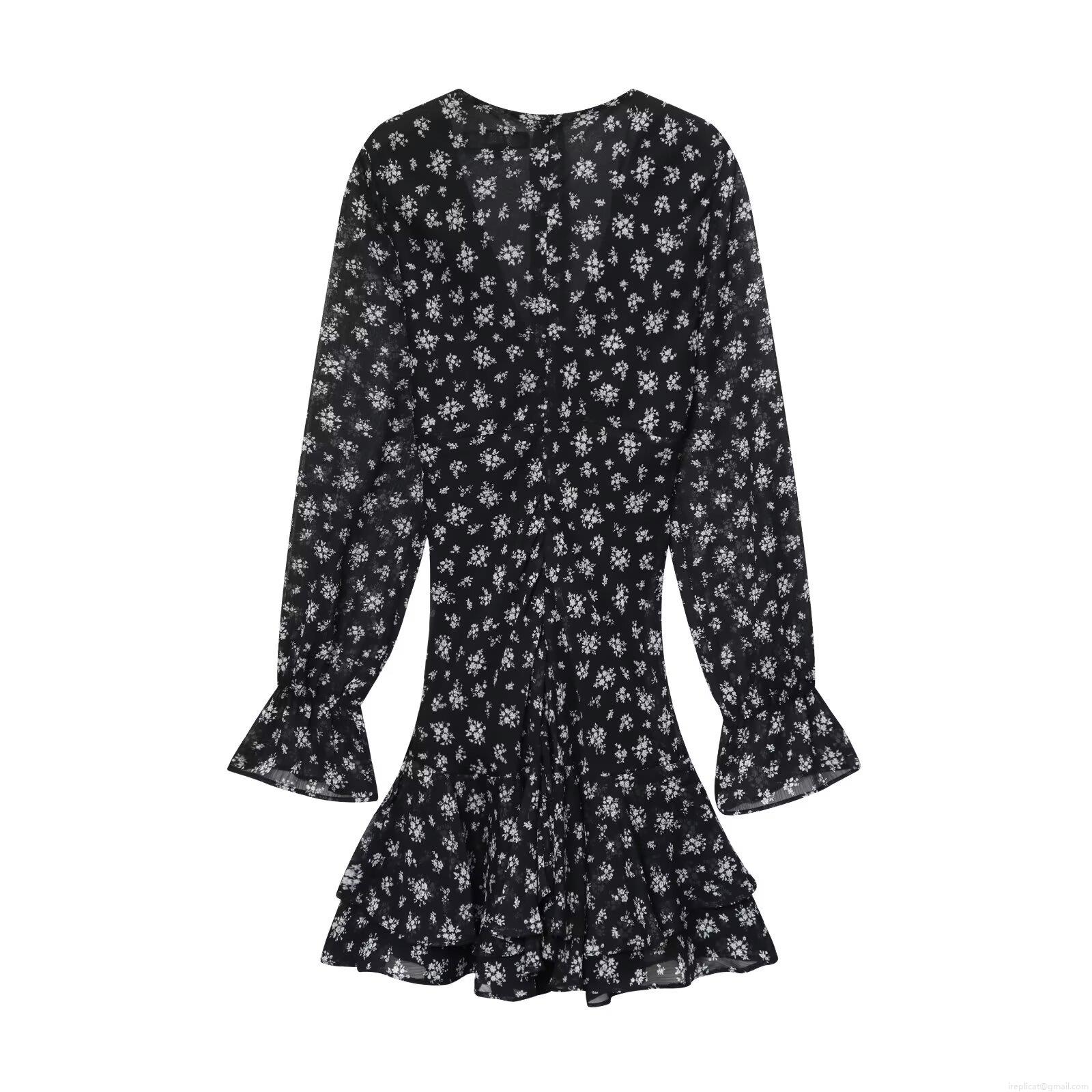 • Elegant Women Floral Printed Chiffon Mini Dress Deep V-Neck Long Sleeve Ruffle Layered Hem Back Zipper Tight Fit Sexy Party Short Dress