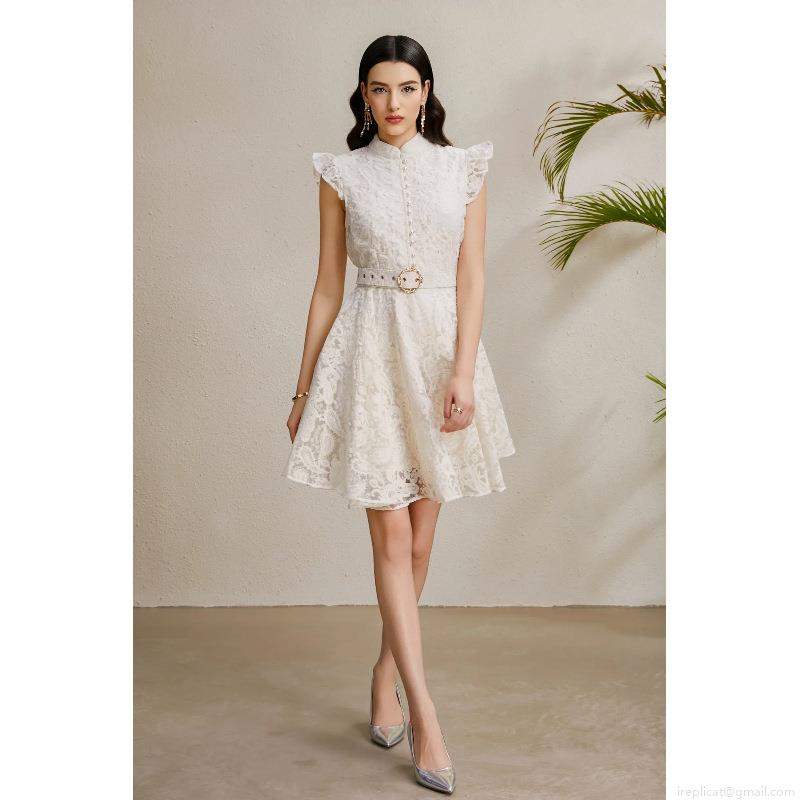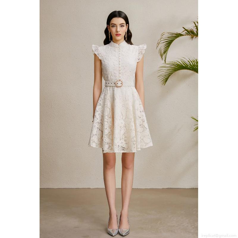 • Elegant Women Lace Embroidery Dress Stand Collar Pearl Button Sleeveless Slim Fit A-Line Mini Dress With Belt For Party Wedding Guest Office Wear Summer Autumn