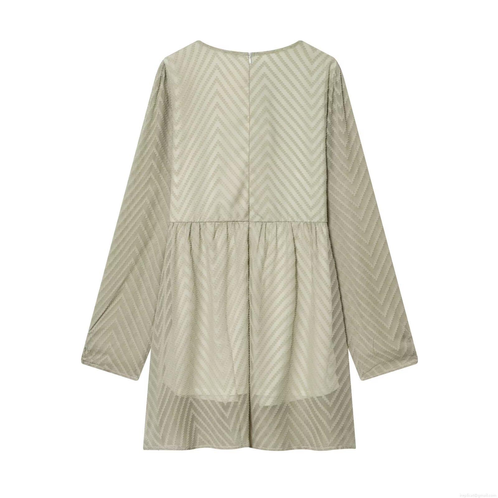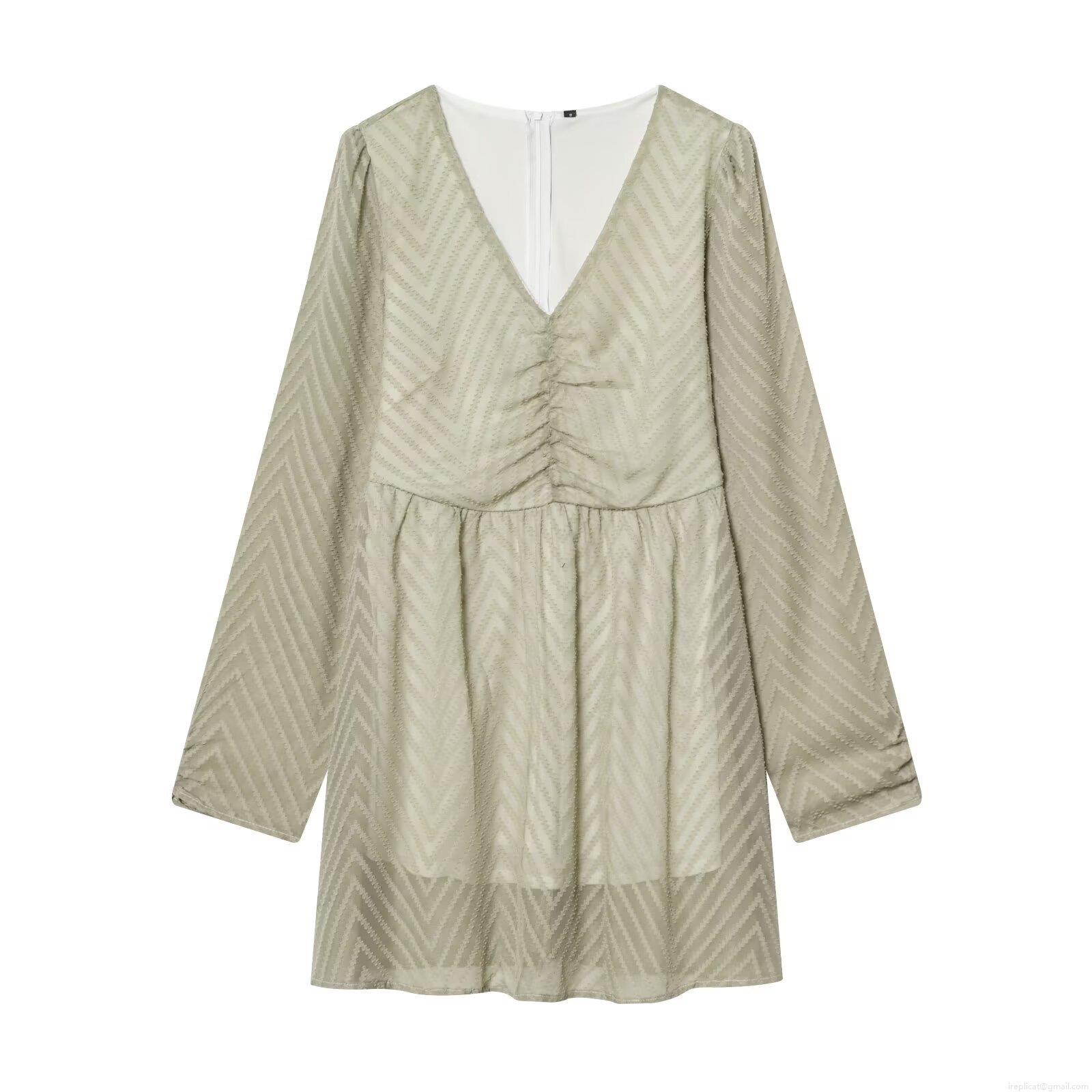 • Elegant Women Long Sleeve V-Neck Mini Dress Polyester Spandex Herringbone Jacquard Ruched Waist A-Line Pullover Dress For Daily Commute