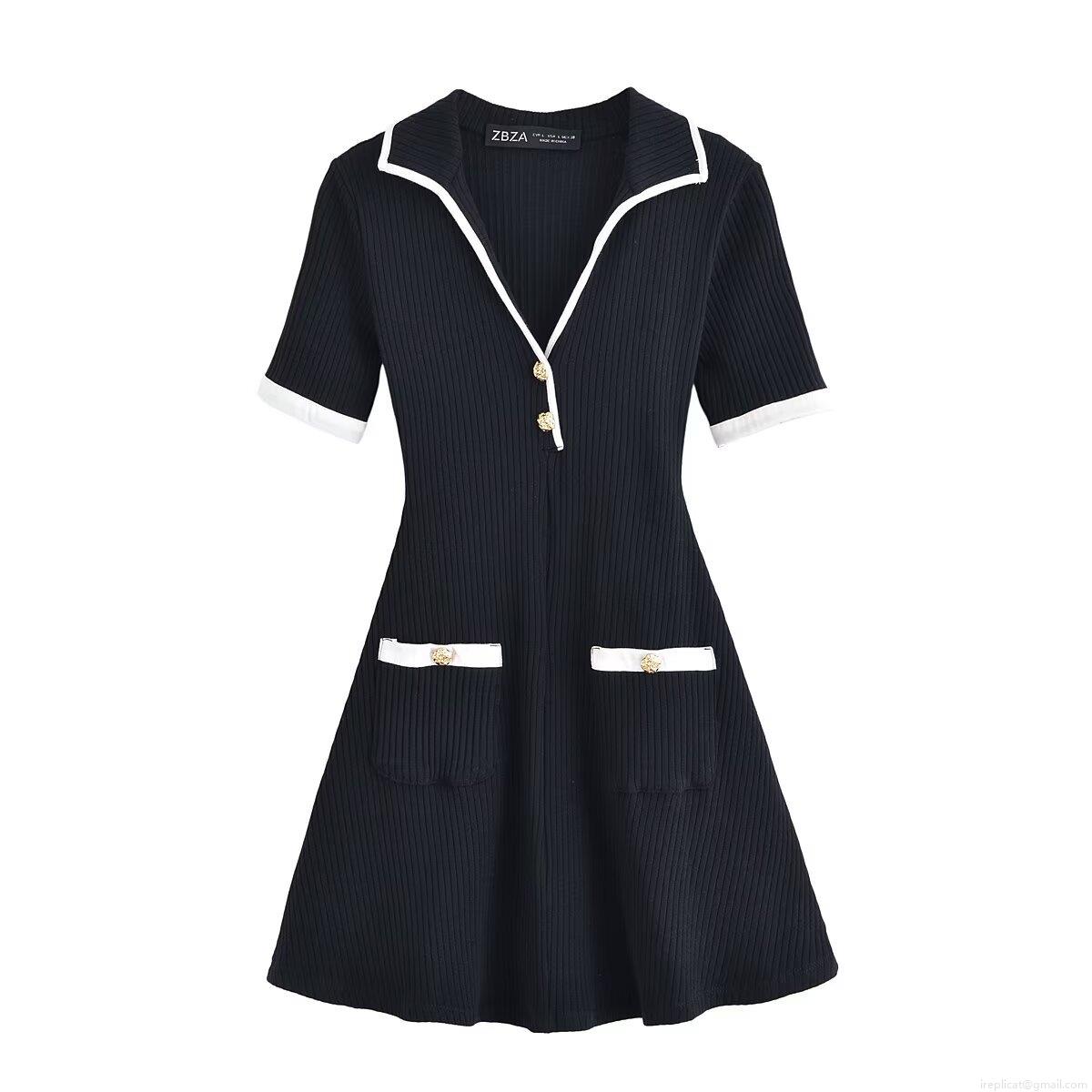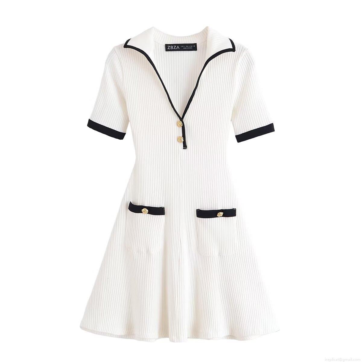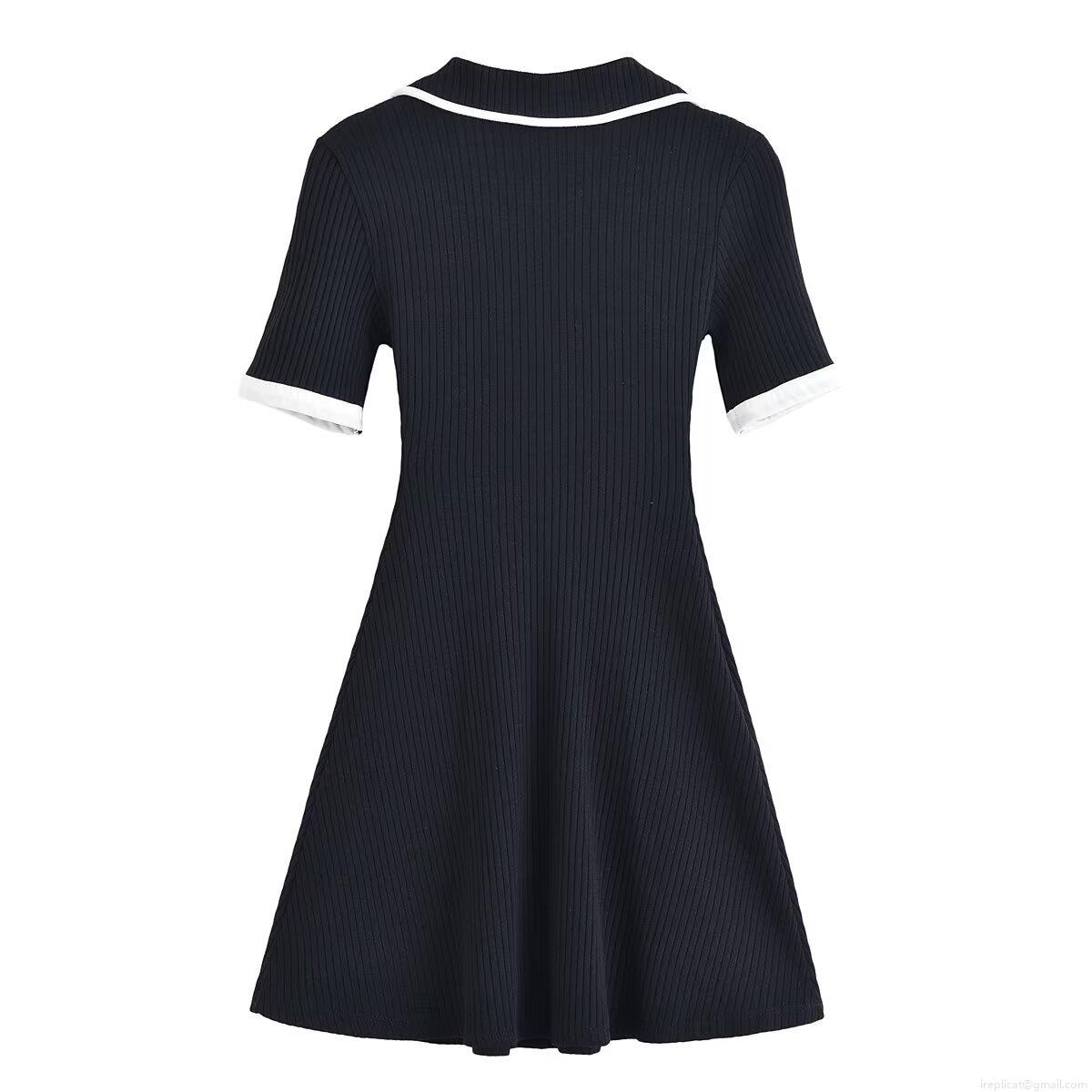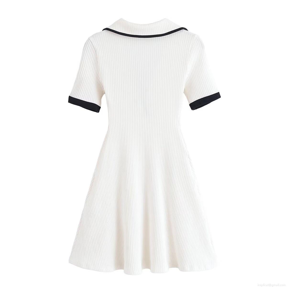 • Elegant Women Ribbed Knit Mini Dress Contrast Color Trim Gold Buttons V Neck Short Sleeve Slim Fit Chanel Style Party Clubwear Office Casual Outfit