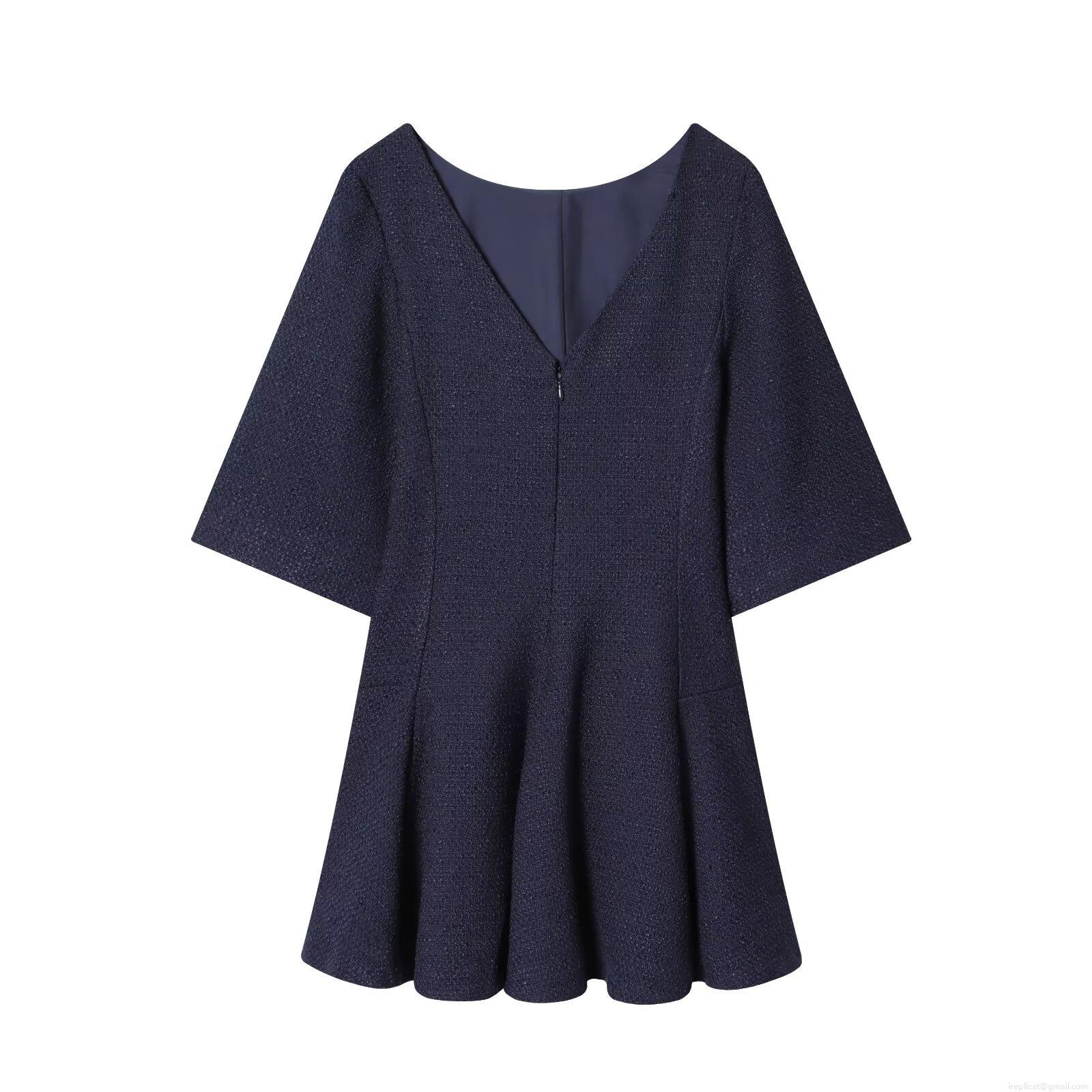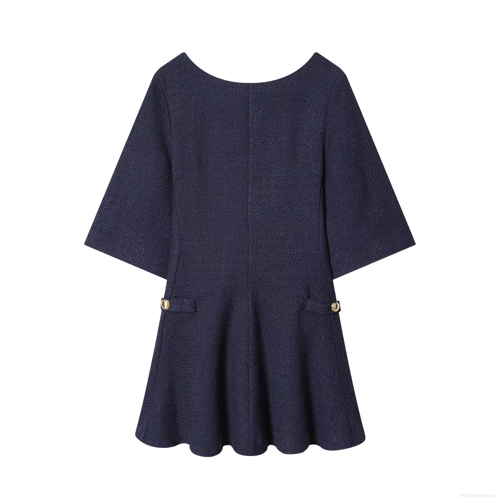 • Elegant Women Tweed A-Line Mini Dress Round Neck Half Sleeve With Gold Buttons For Party Office Office Lady Style Short Dress