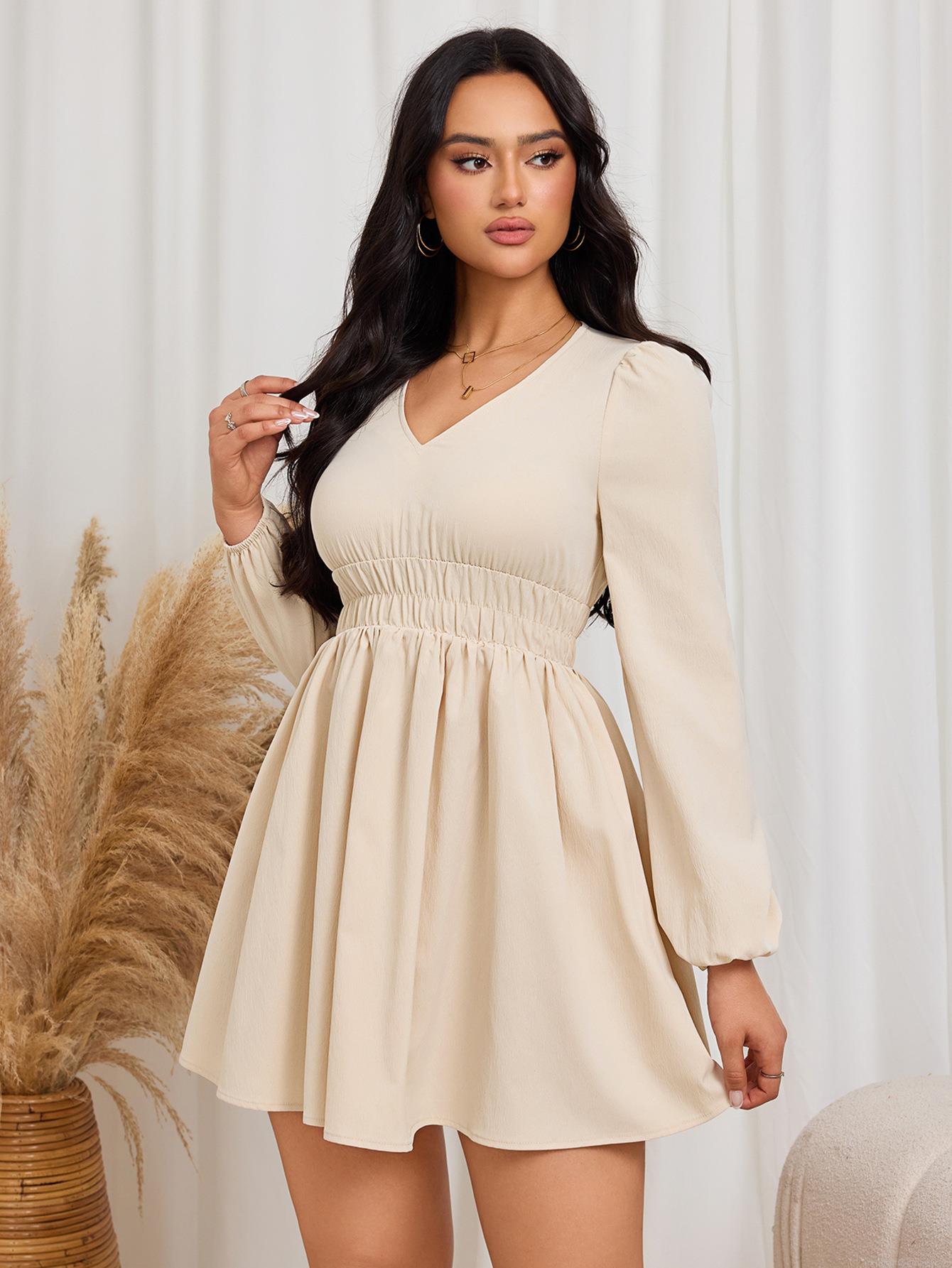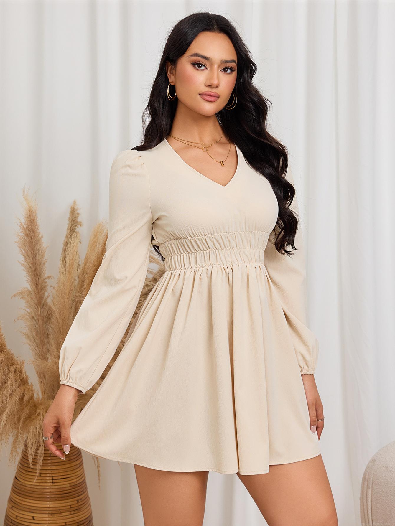 Solid Color, Pleats, Waist shaping, V-neck, Puff Sleeves