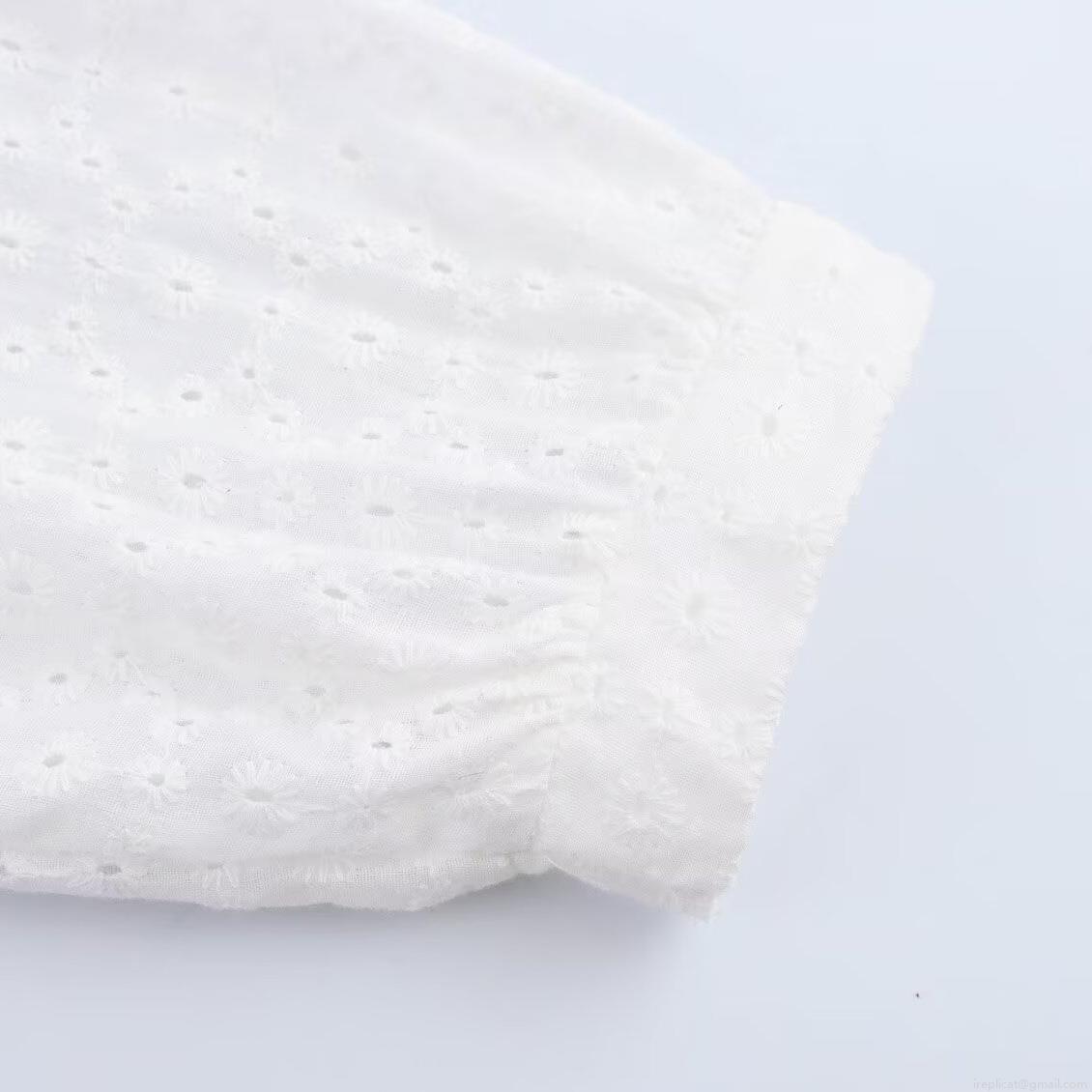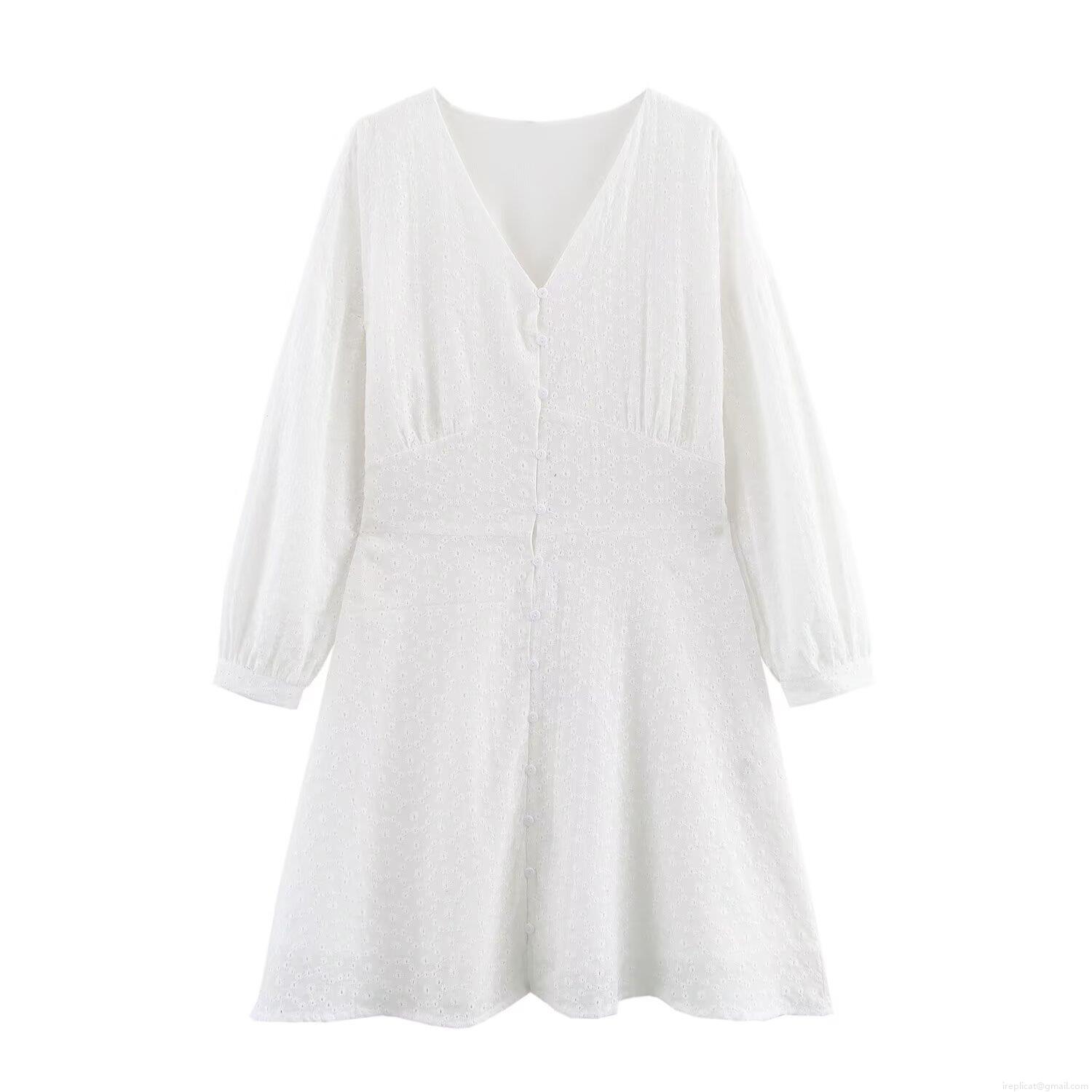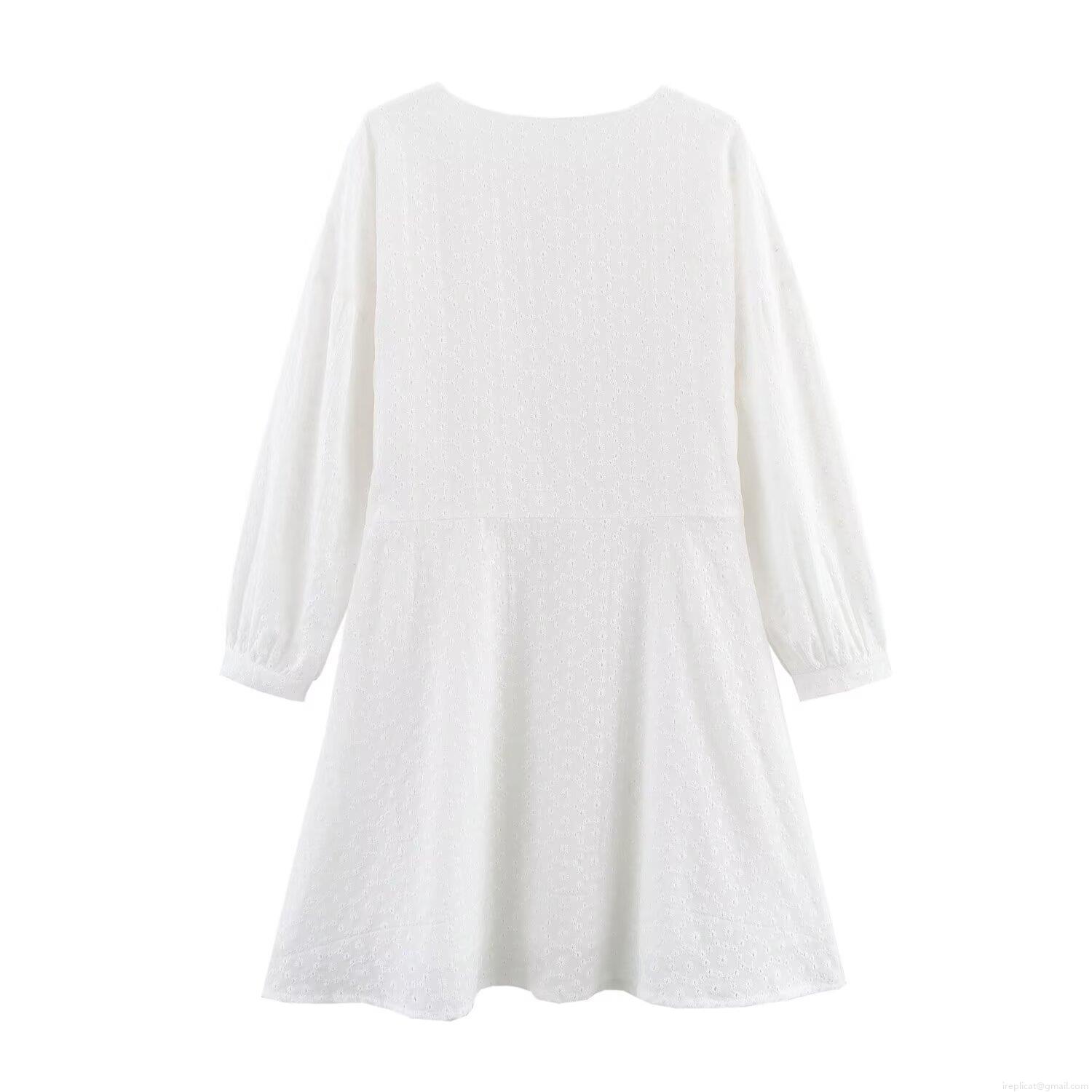 Elegant Women White V-Neck Embroidery Hollow Out Mini Dress 3/4 Sleeve High Waist A-Line Party Short Dress Pullover Summer Fashion Lady Clothing