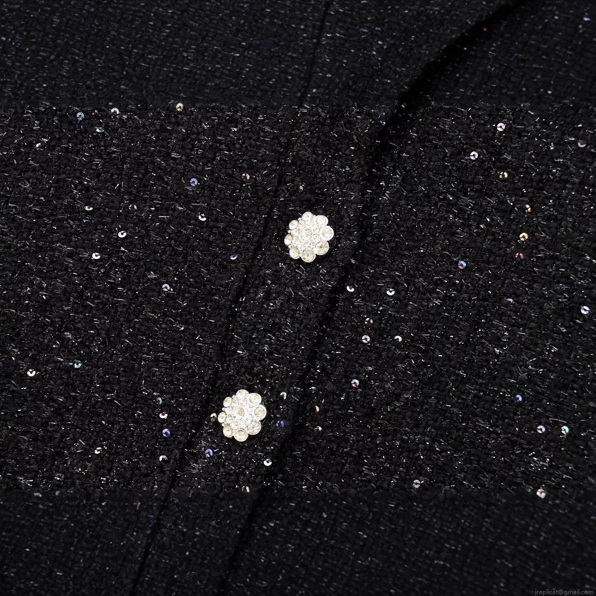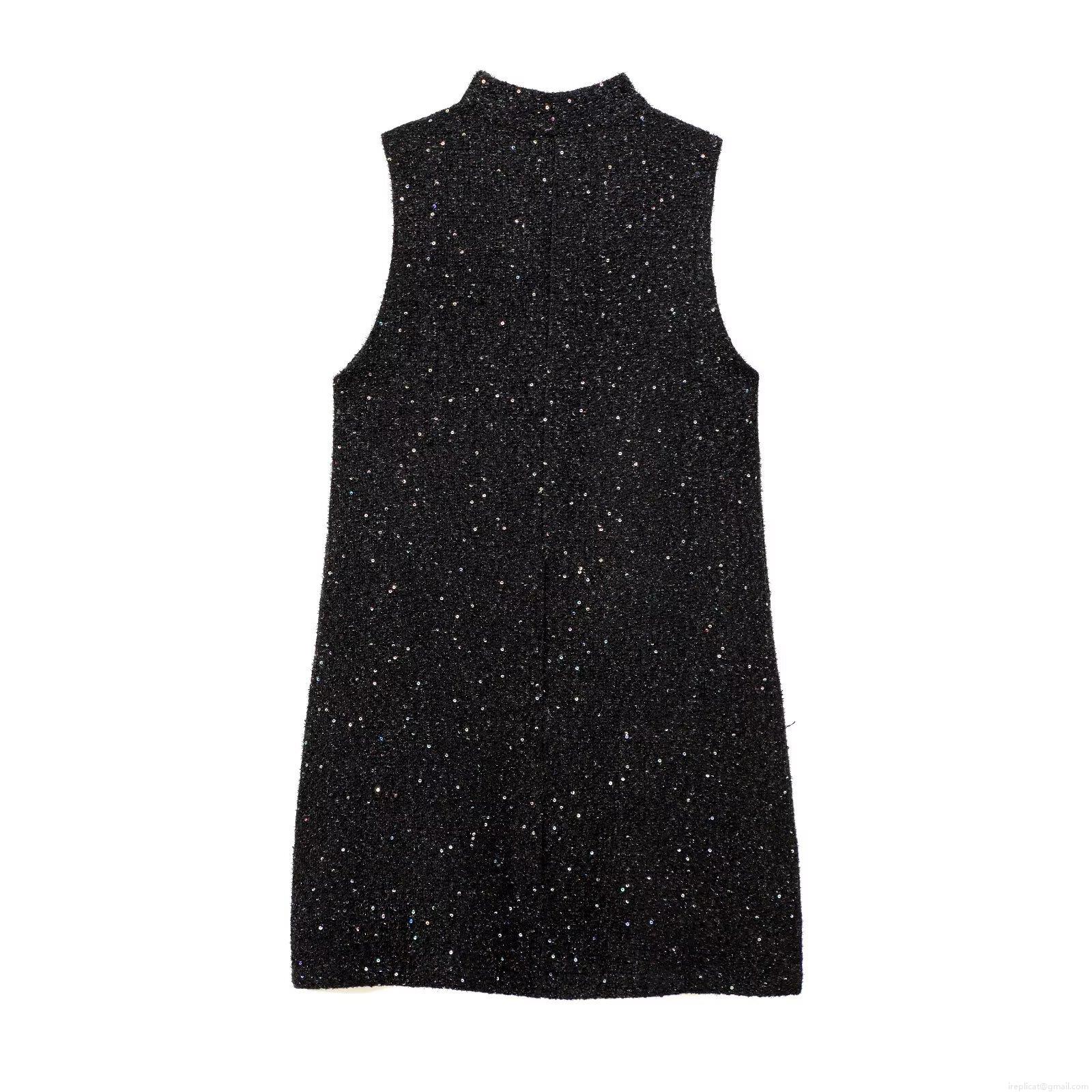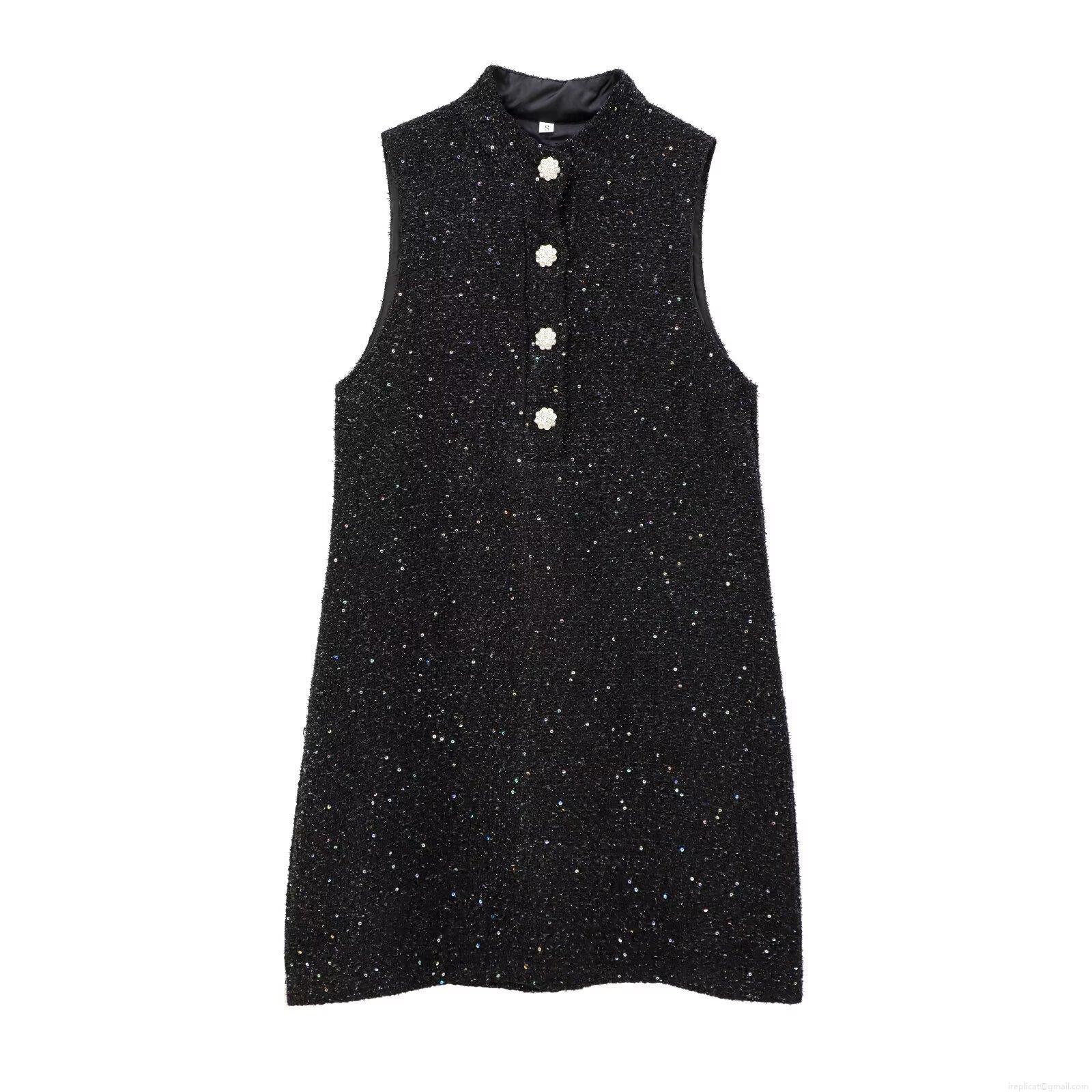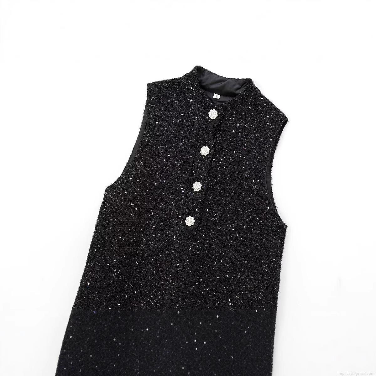 • Elegant Women's Black Tweed Sleeveless Mini Dress With Shiny Sequins And Pearl Rhinestone Buttons Stand Collar Slim Fit Socialite Style Evening Party Dress
