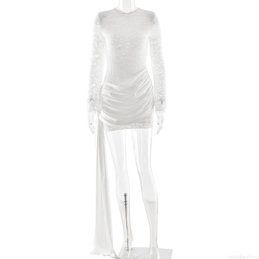 • Elegant Women's Lace Patchwork Backless Bodycon Dress Long Sleeve High Waist Ruched Satin Mini Dress With Streamer For Party Banquet Clubwear Sexy Solid Color Short Dress