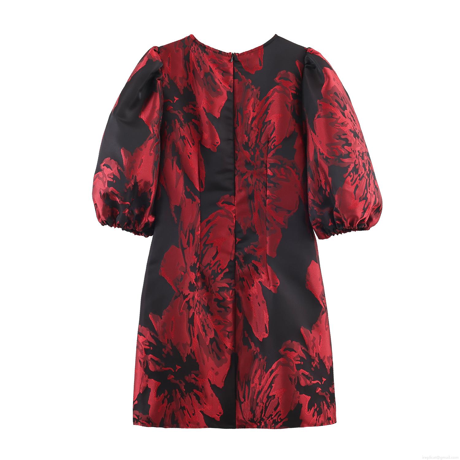 • Elegant Women's Retro Jacquard Mini Dress Sexy Deep V Neck Puff Sleeve Slim Fit Floral Pattern Banquet Evening Party Dress For Lady