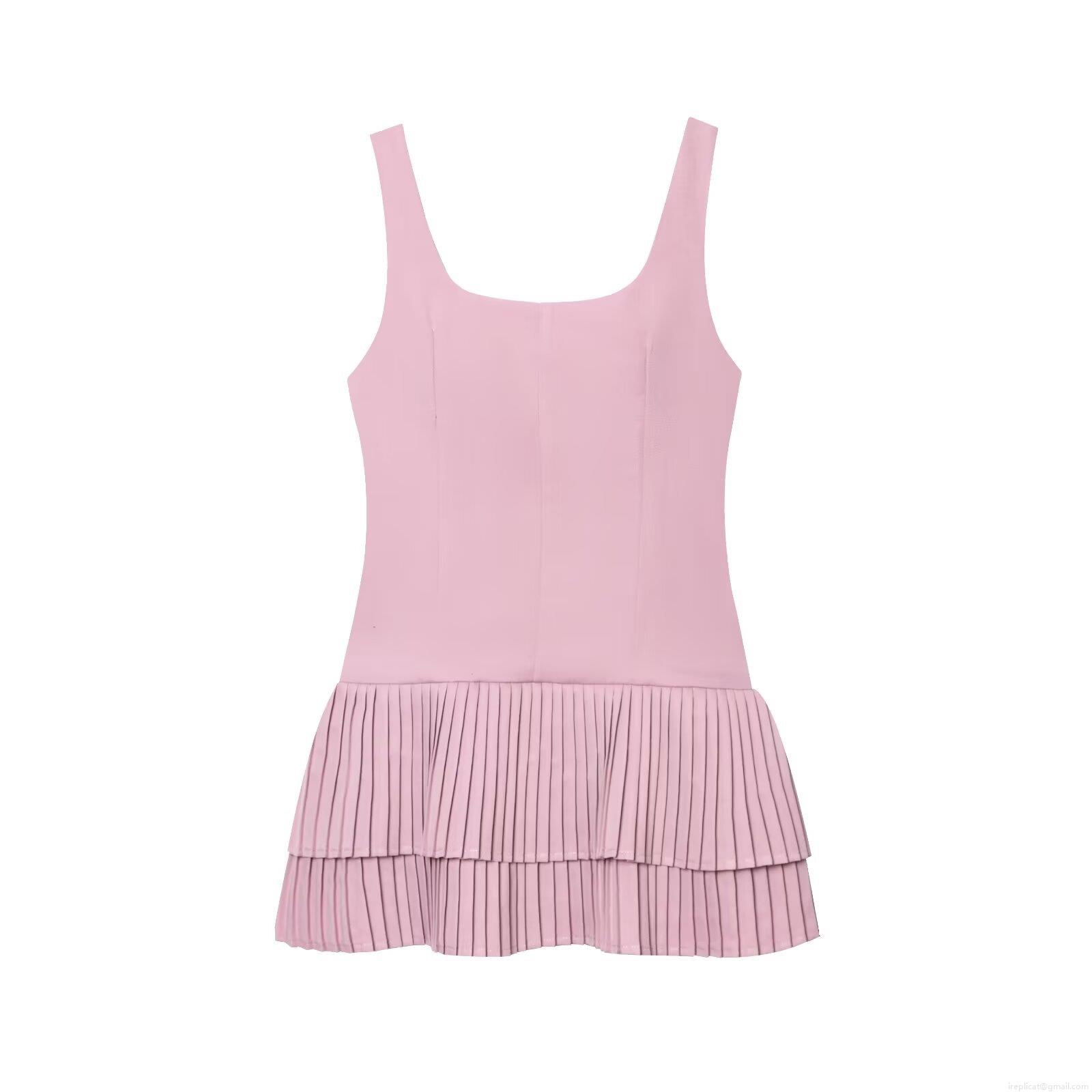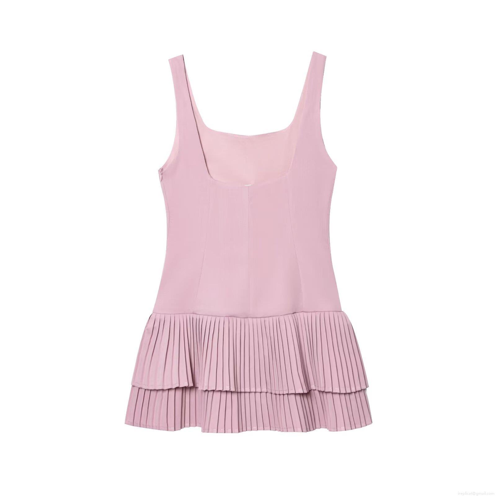 • Elegant Women's Sleeveless Mini Dress Double Layer Pleated Hem Square Neck Solid Color Polyester Dress For Party Date Night Summer