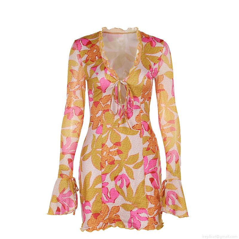 • Floral Long Sleeve Mini Dress Polyester Mesh V-Neck Tie-Up Bodycon Ruffle Hem Autumn Vacation Elegant Fashion Women Slim Fit Short Dress