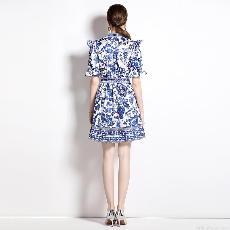 • French Elegant Blue And White Porcelain Print Dress Women's V Neck Puff Sleeve Single Breasted Ruffle A-Line Mini Dresses For Summer Party Vacation Casual Clothing