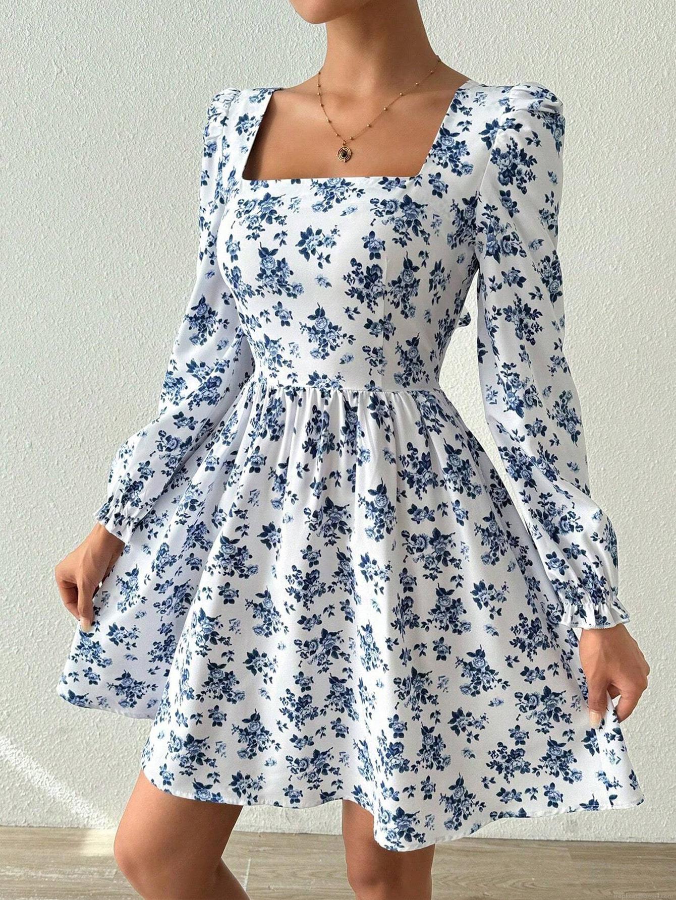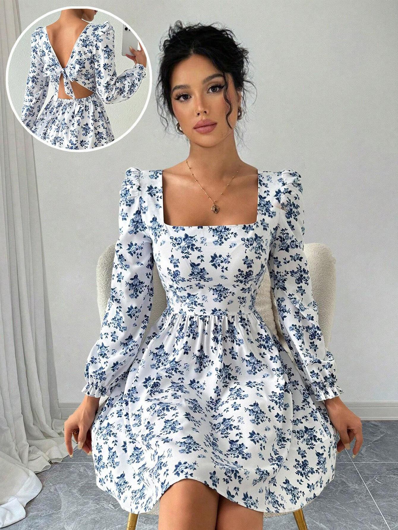 • French Elegant Floral Mini Dress For Women Square Neck Backless Lace Up High Waist Puff Sleeve A-Line Short Sundress Vacation Chic Outfit