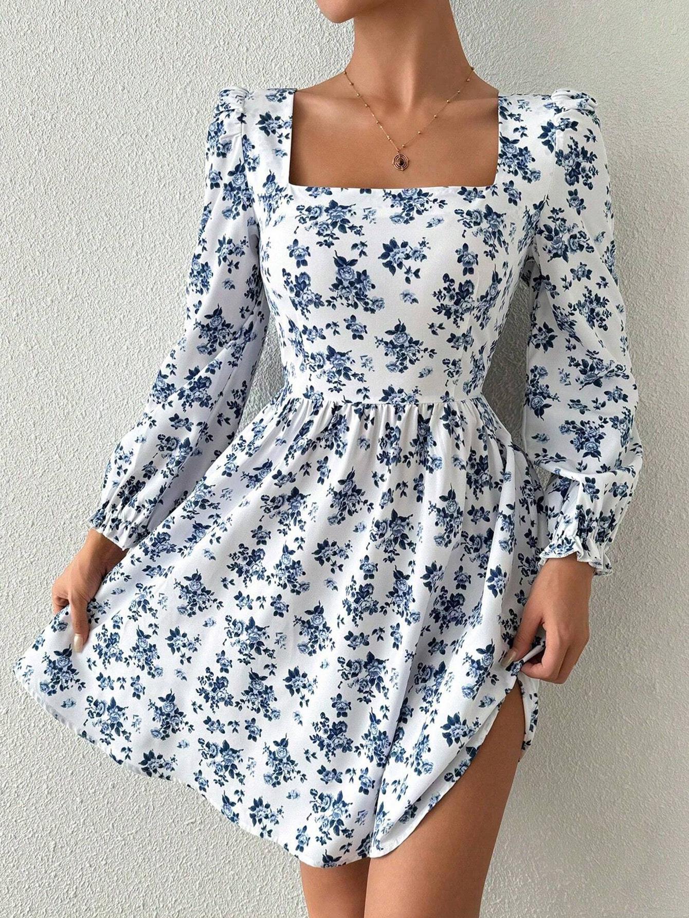 Floral Pattern, Hollow Out, Waist shaping, Straps, Backless, Puff Sleeves, Square Collar