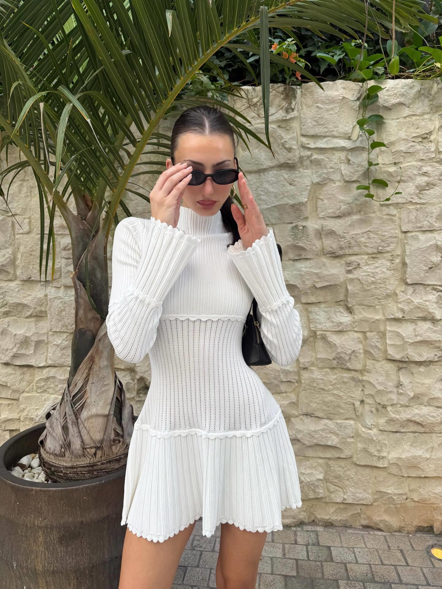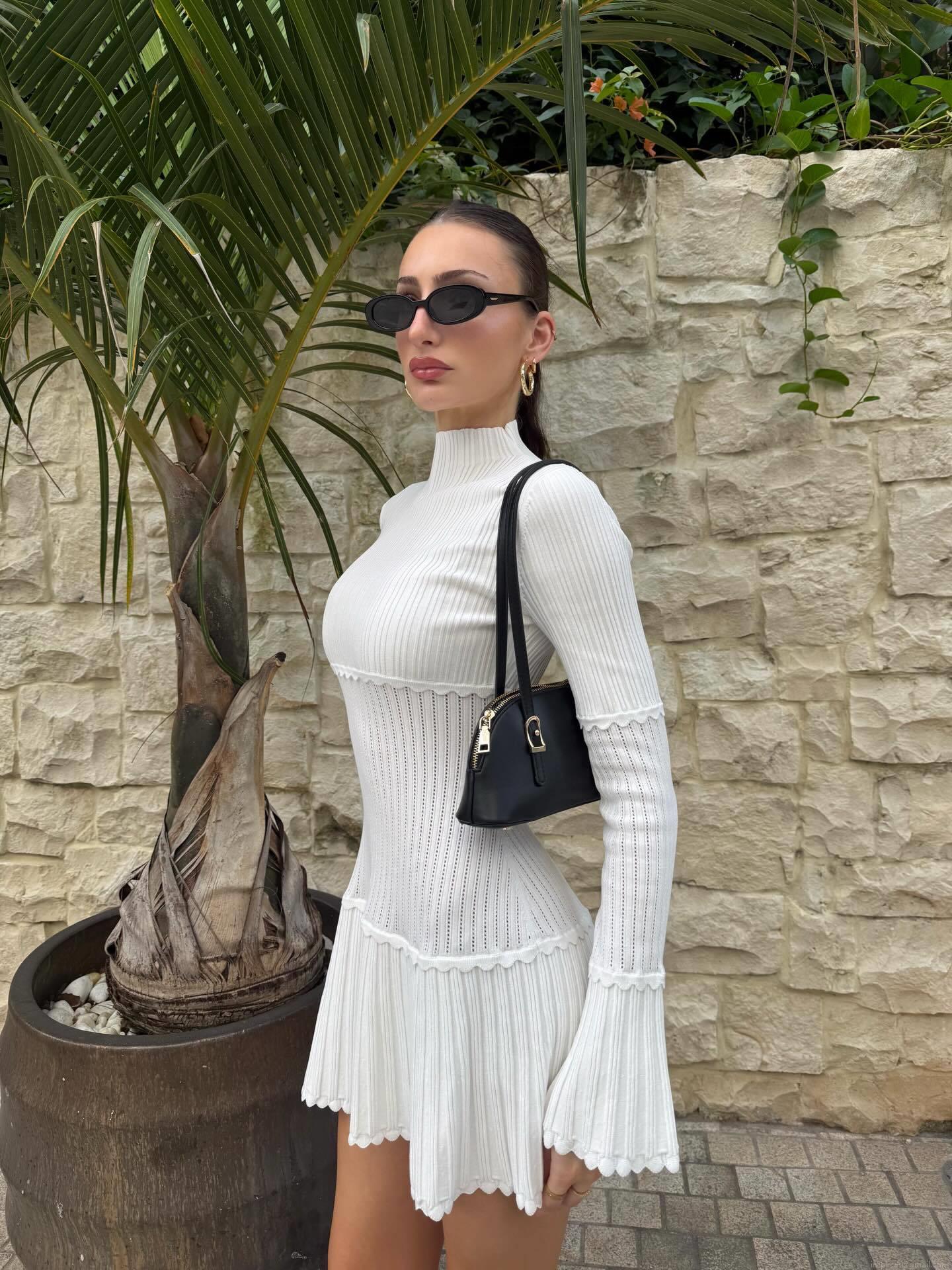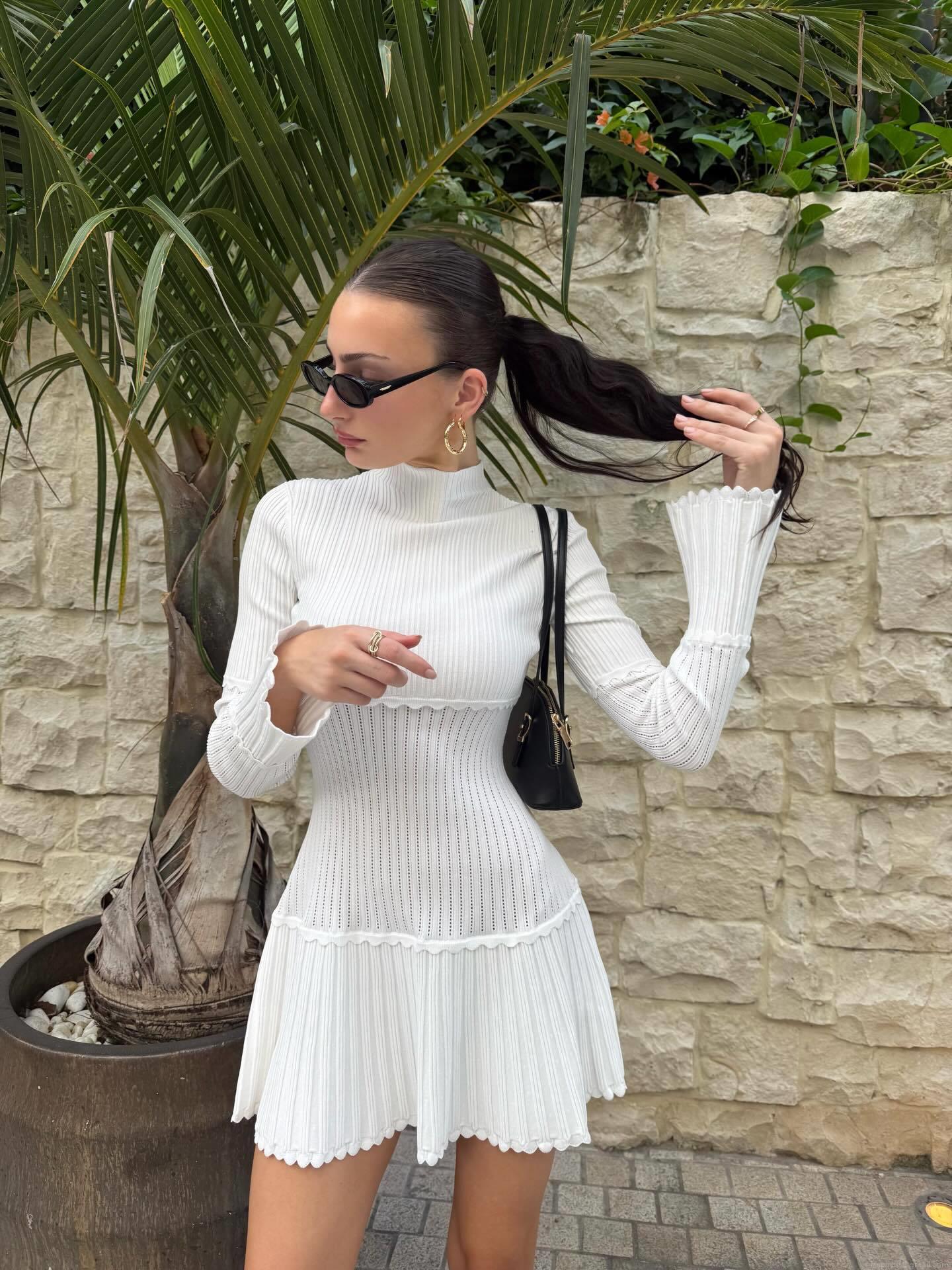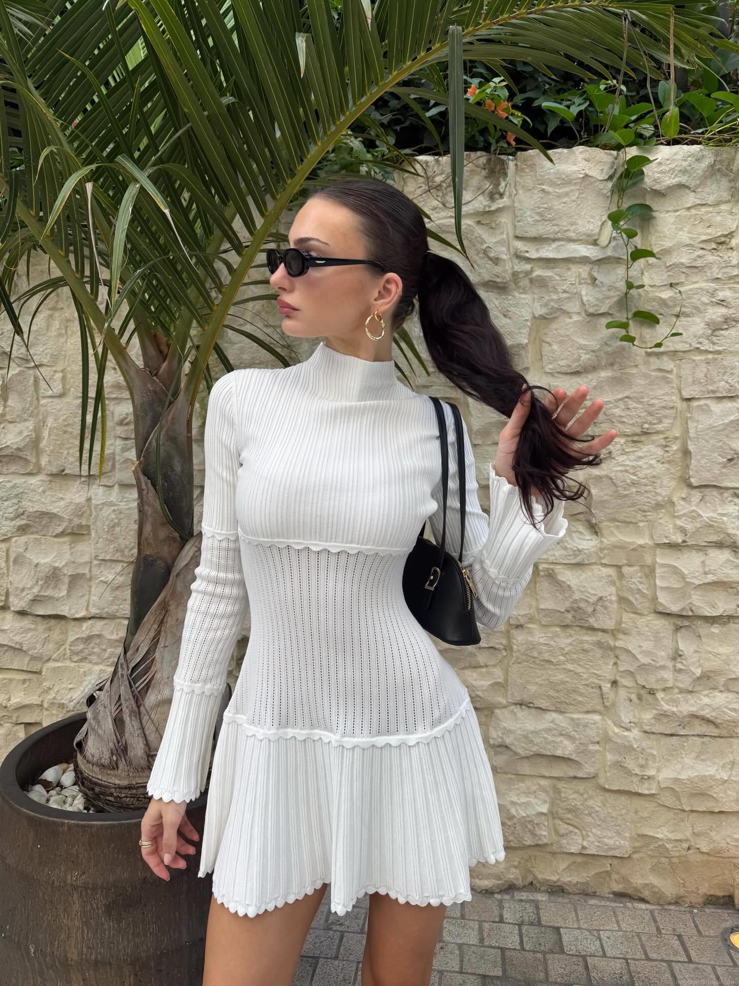• French Elegant Slim Fit Knit Dress Women Pearl White Long Sleeve High Neck Lettuce Trim A-Line Mini Dress Ribbed Texture Chic Streetwear Autumn Spring Pullover Dress