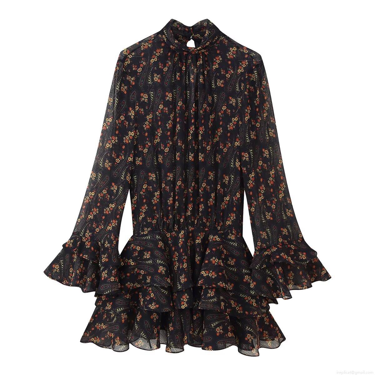 • French Floral Chiffon Mini Dress Elegant High Neck Long Sleeve Ruffle Tiered Cake Dress Bohemian Style Paisley Print Short Dress For Women Party Vacation