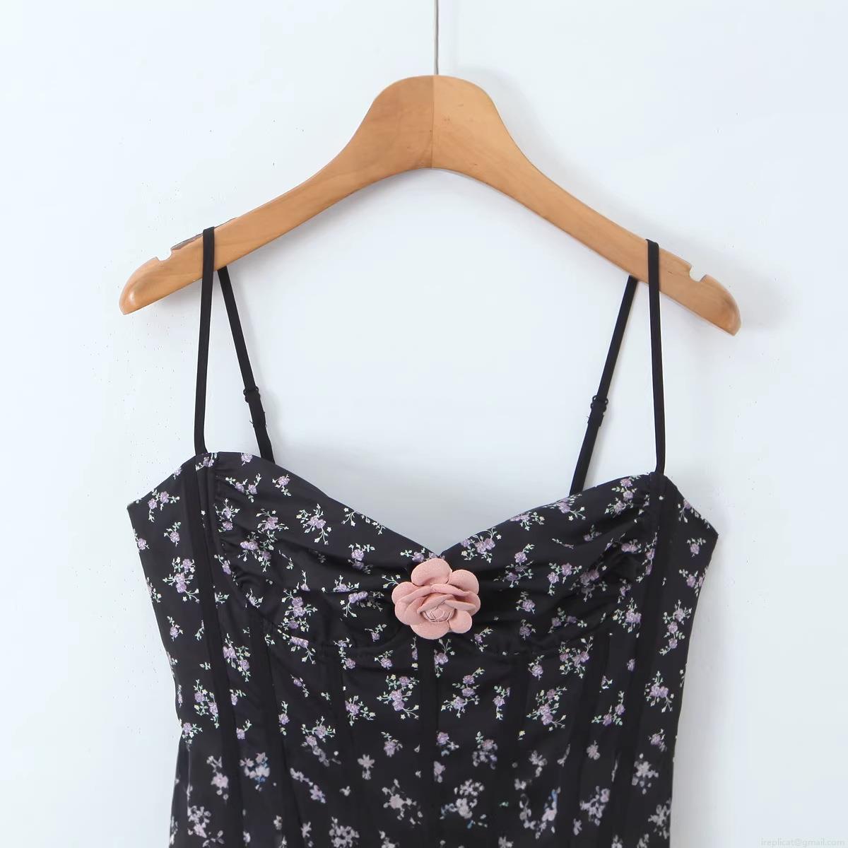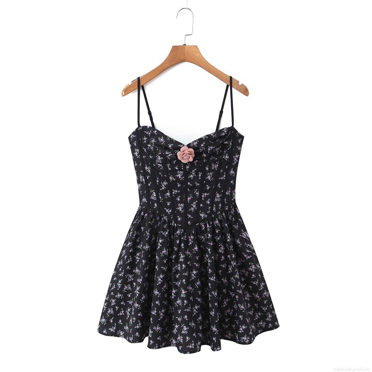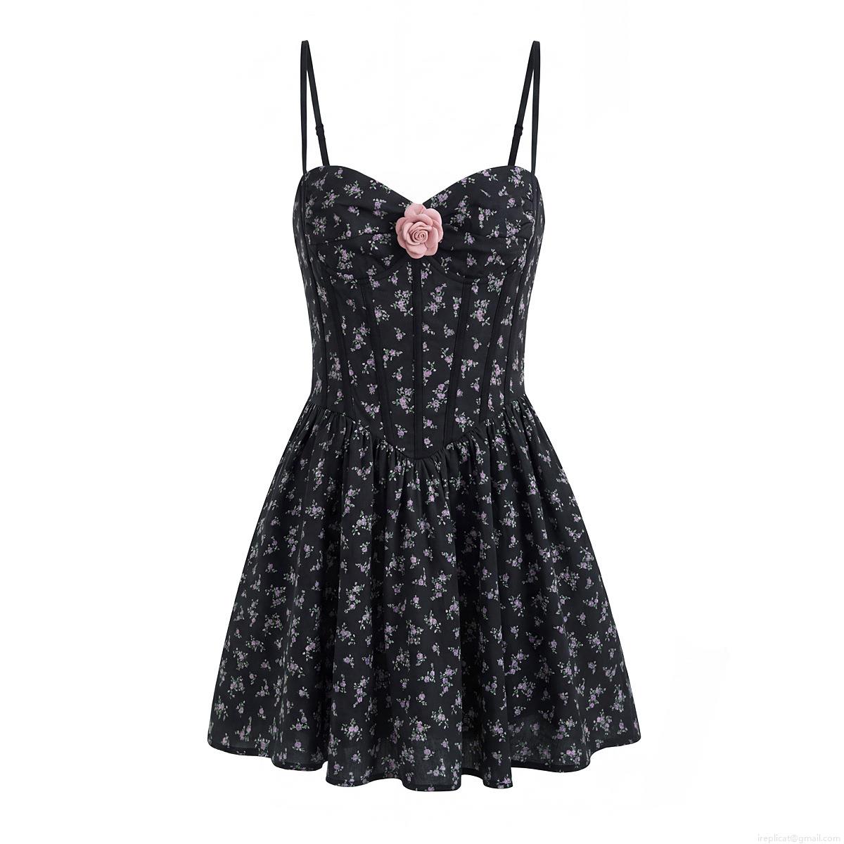 French Retro Floral Spaghetti Strap Mini Dress 3D Rose Polyester Corset A-Line Sexy Backless Lace-Up Party Dress Women Summer Outfit