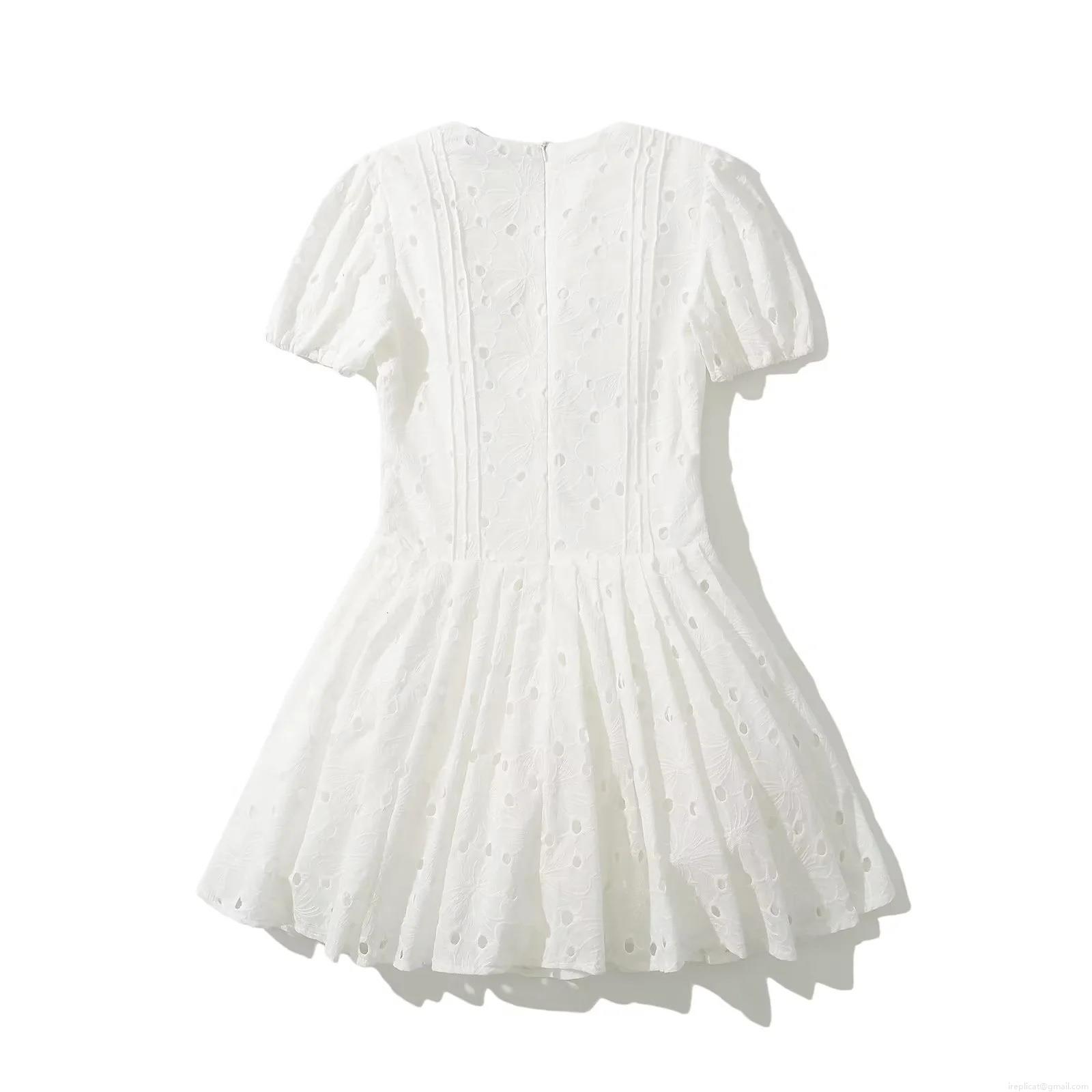 French Retro White Cotton Hollow Out Embroidery V-Neck Mini Dress Women Summer Bubble Sleeve Tie Waist Sexy A-Line Vacation Party Short Dress