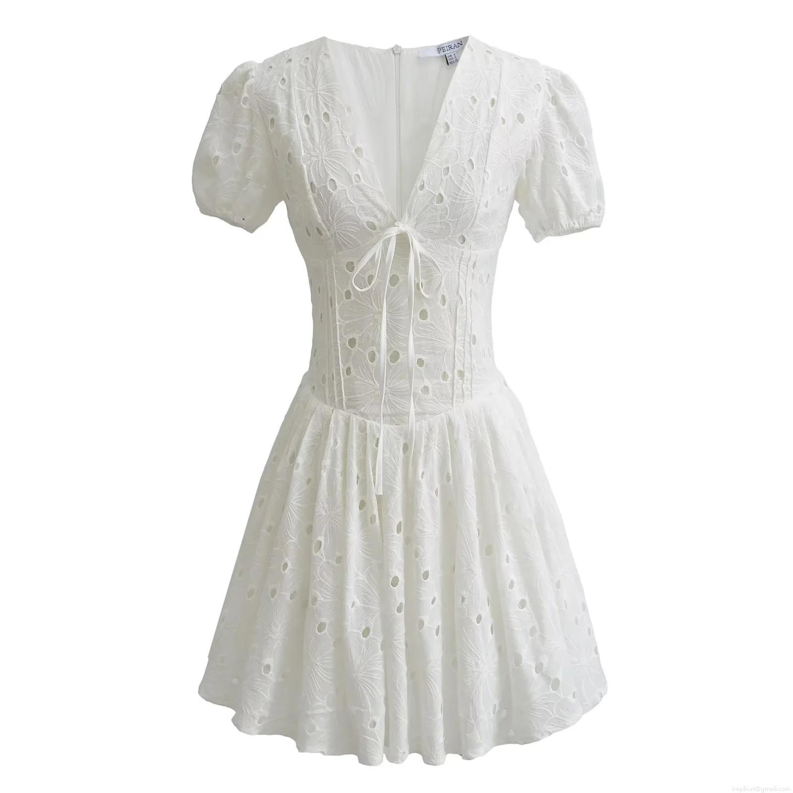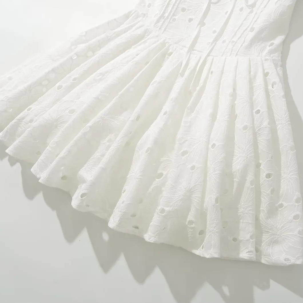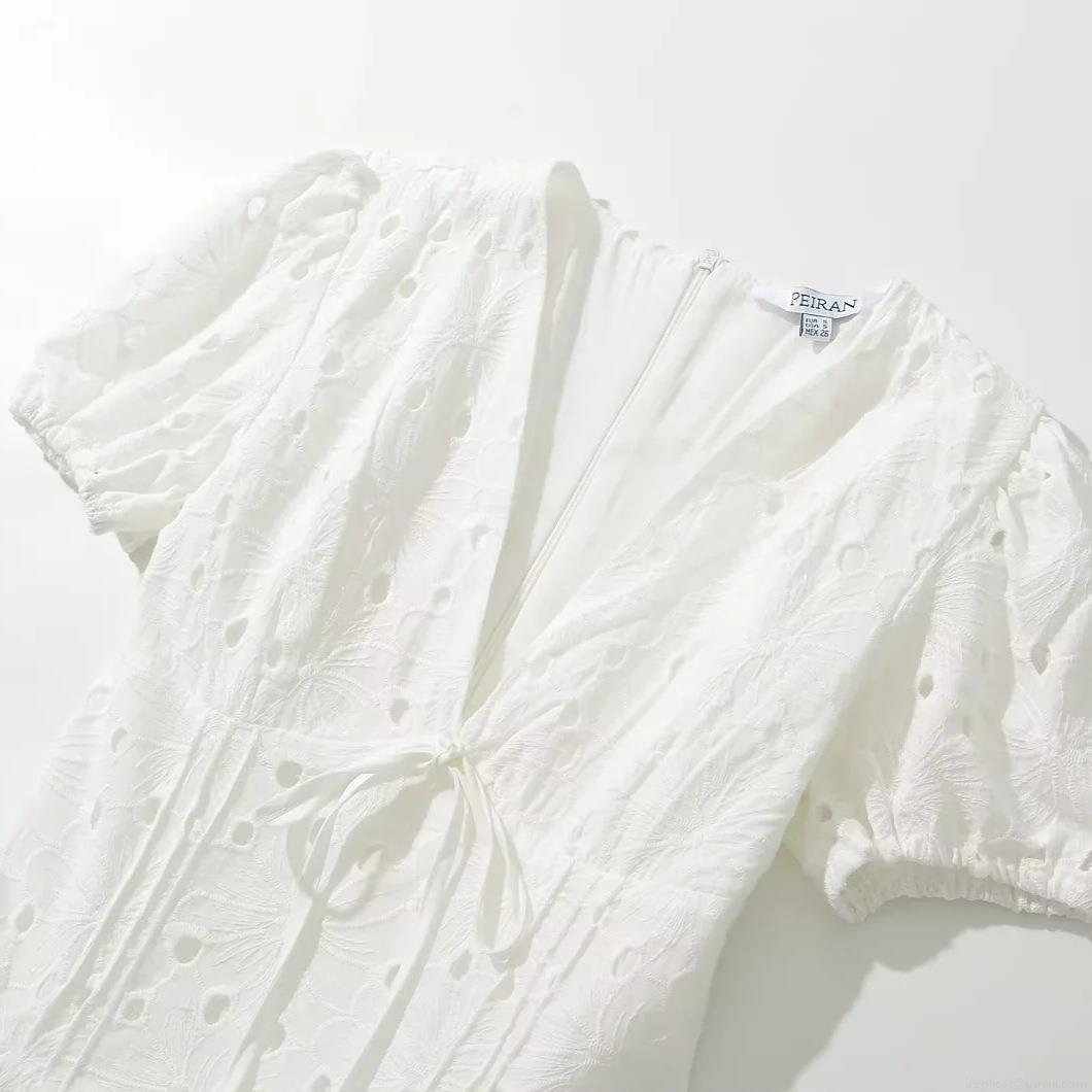 • French Retro White Cotton Hollow Out Embroidery V-Neck Mini Dress Women Summer Bubble Sleeve Tie Waist Sexy A-Line Vacation Party Short Dress