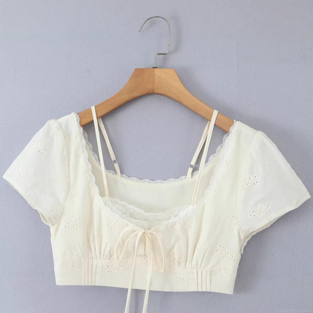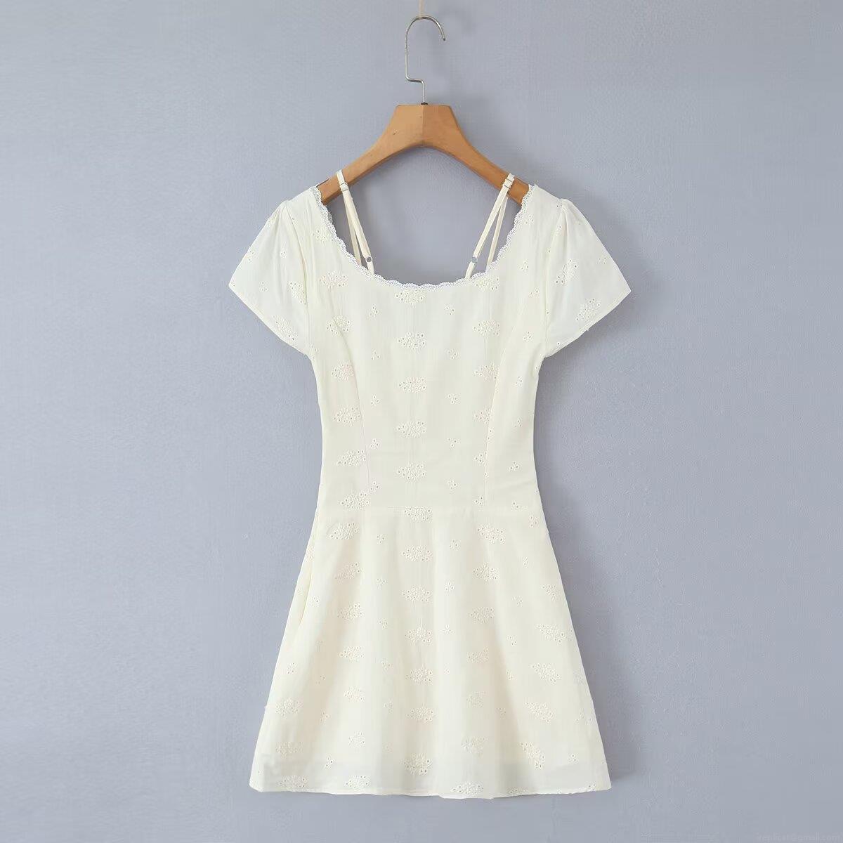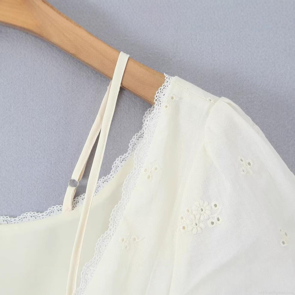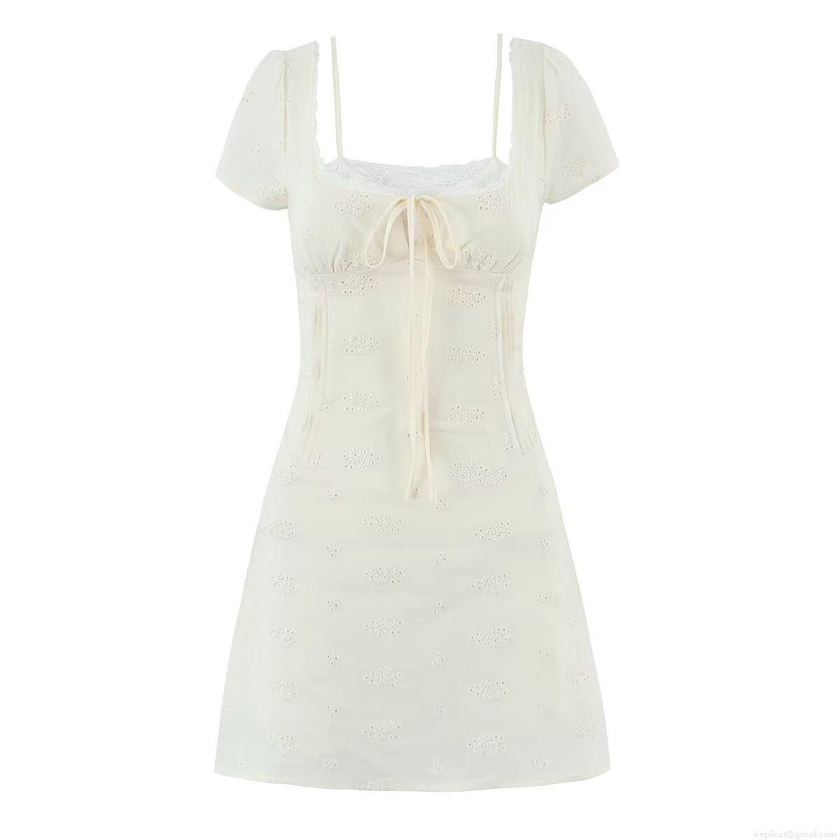 • French Retro White Floral Embroidery Mini Dress For Women Summer Lace Trim Puff Sleeve Cotton Ruched A-Line Short Dress Square Neck Tie Front Fairy Style