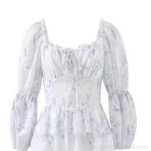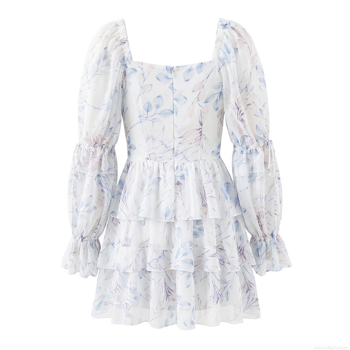 • French Romantic Chiffon Mini Dress Floral Ink Print V-Neck Bubble Long Sleeve Tiered Ruffle Dress For Women Elegant High Waist Party A-Line Dating Vacation Outfit