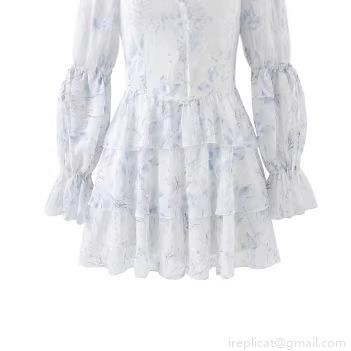 Floral Pattern, Ruffles, Lace, Off-shoulder, Puff Sleeves, High-waisted, Ink And Wash Printing, Leaf Print, Cake Skirt
