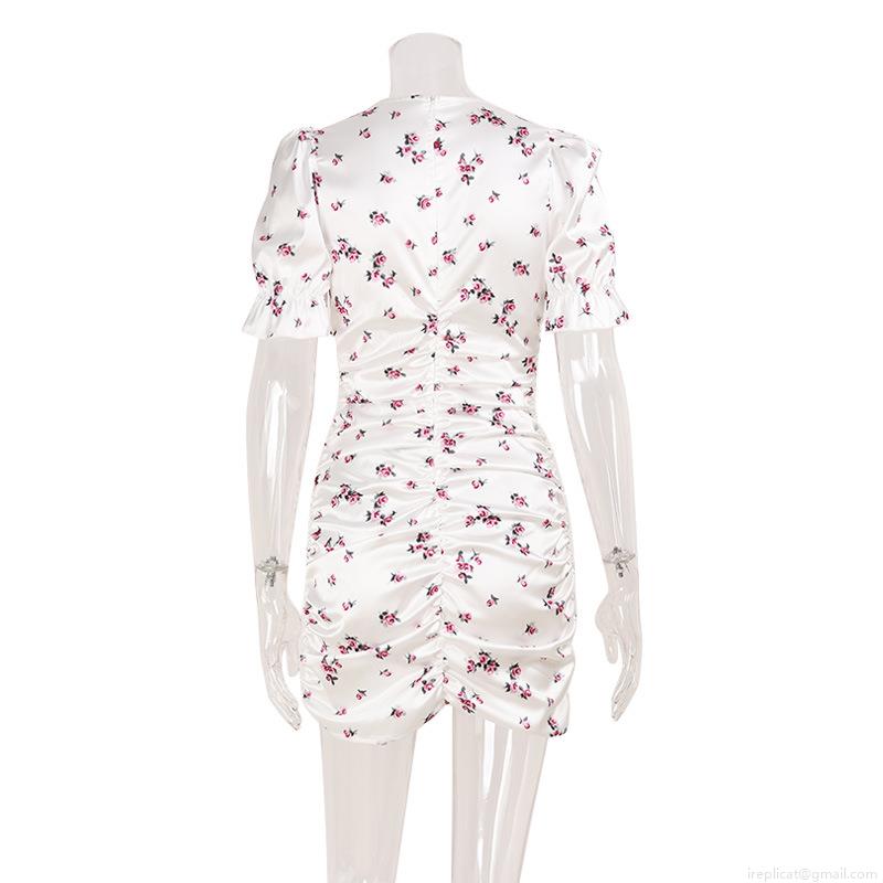 • French Sexy V Neck Floral Puff Sleeve Bodycon Mini Dress For Women Satin Ruched Slim Fit Pink Rose Print Short Summer Party Dress