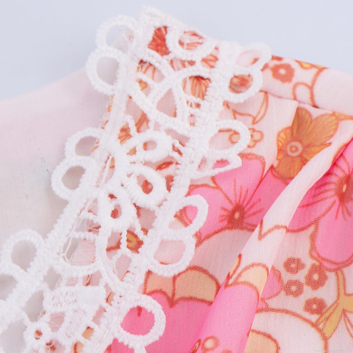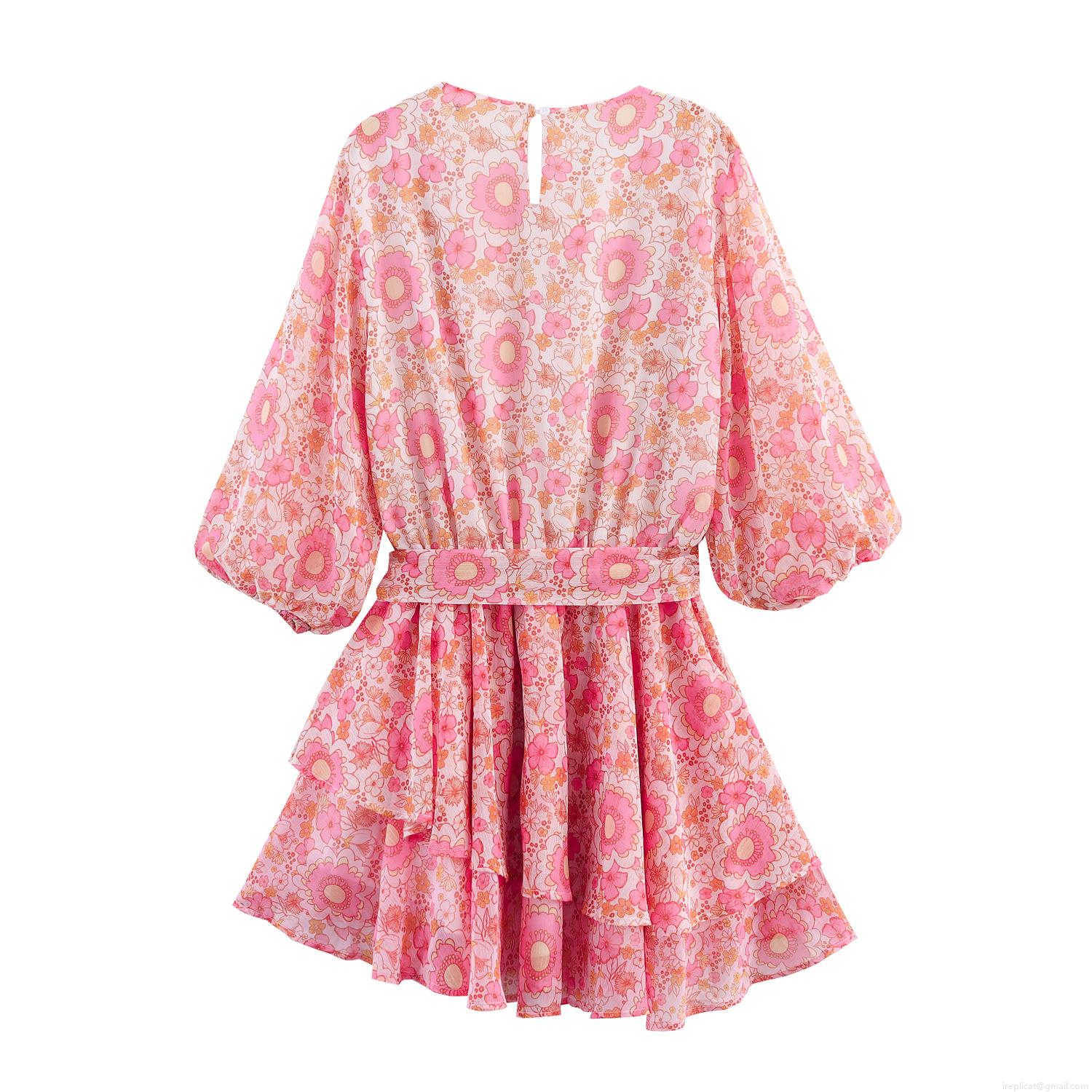 • French Style Floral Print V-Neck Dress For Women Pink Chiffon Long Sleeve Mini Dress With Lace Trim Tiered Ruffle Hem Bow Tie Waist Elegant Casual Summer Vacation Party Dress