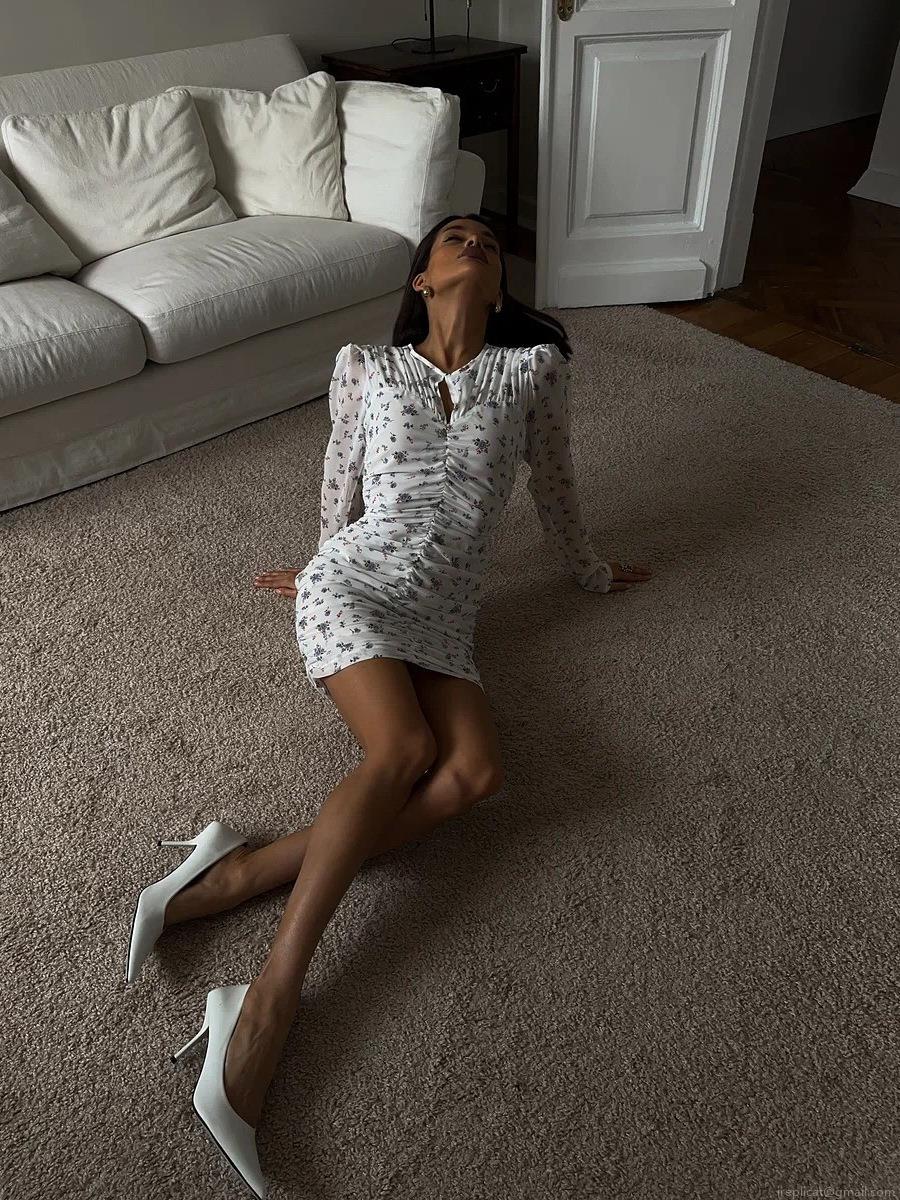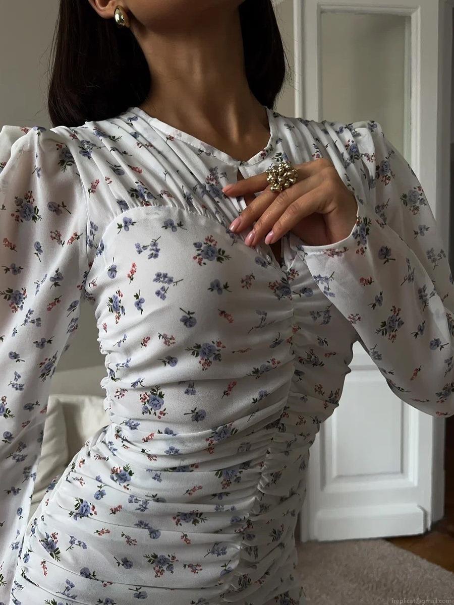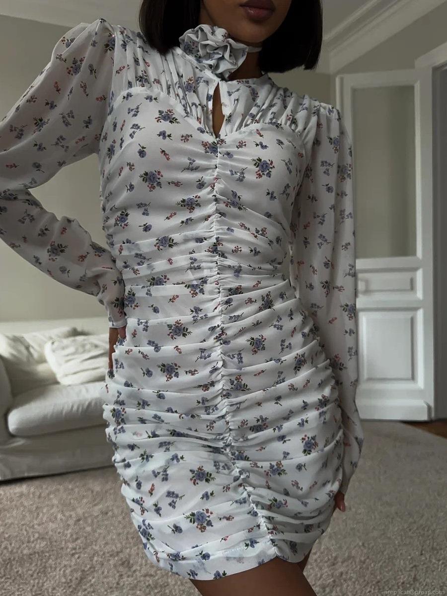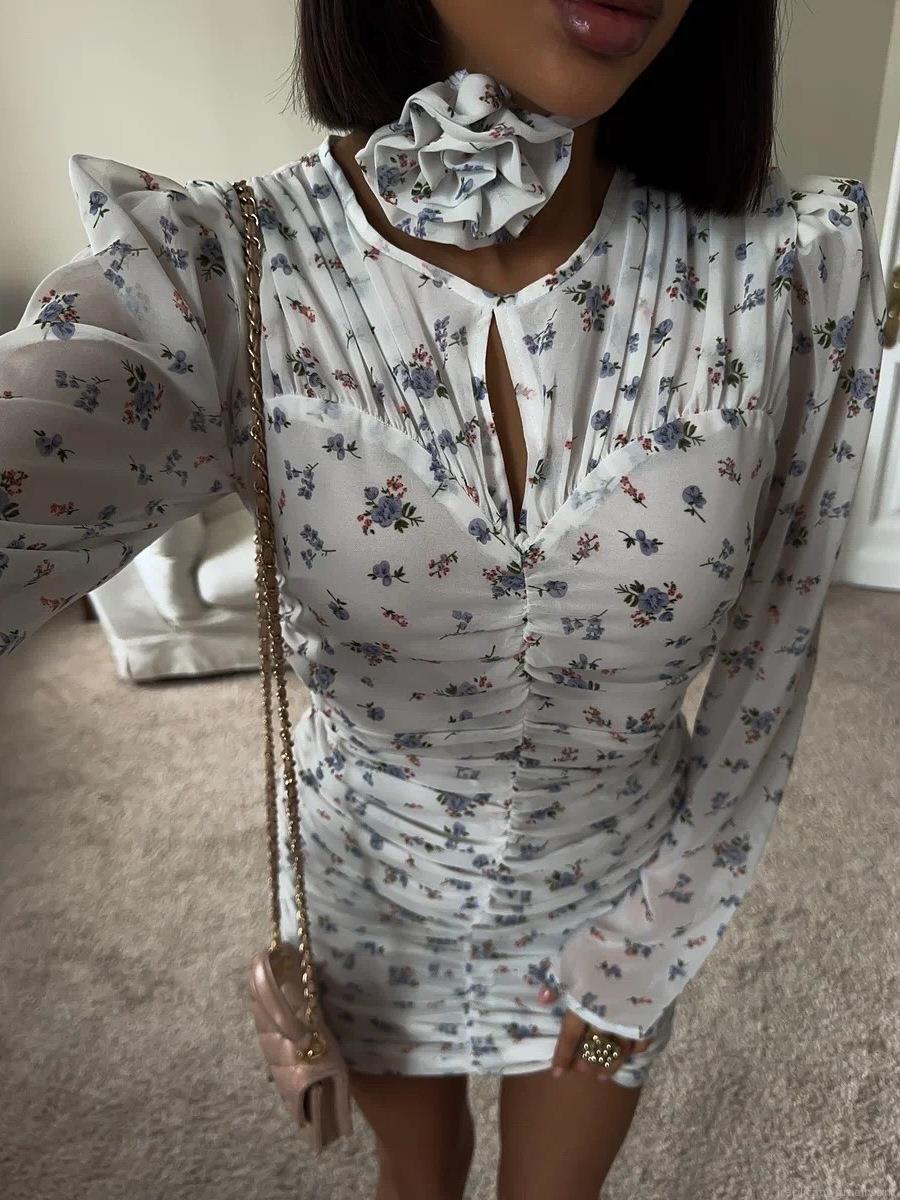 • French Style Floral Ruched Mini Dress For Women Sexy Bodycon Long Sleeve Chiffon Dress With Matching Flower Choker Necklace Party Date Wear