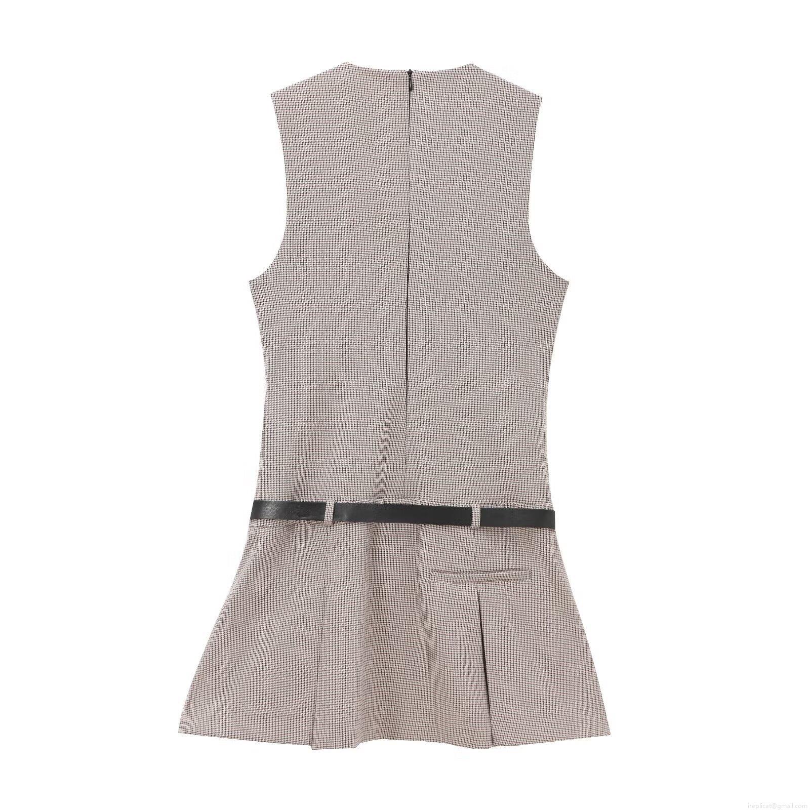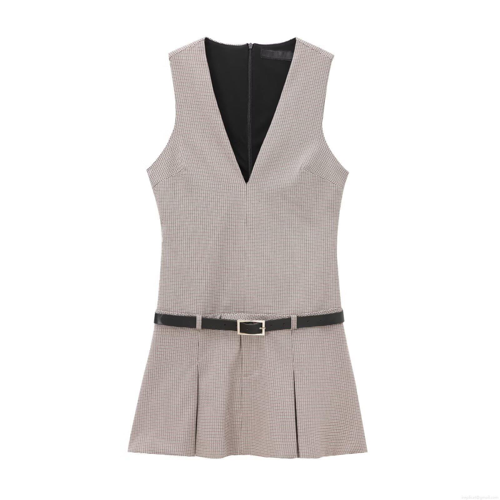 French Style Houndstooth Sleeveless V-Neck Mini Dress With Belt Elegant High Waist Pleated A-Line Polyester Dress For Women Daily Fashion Dress