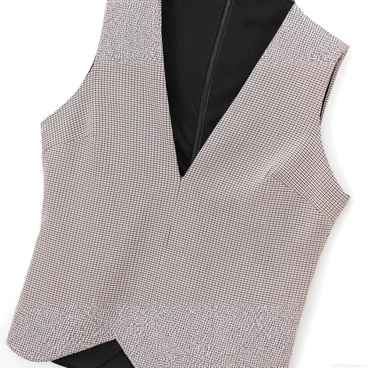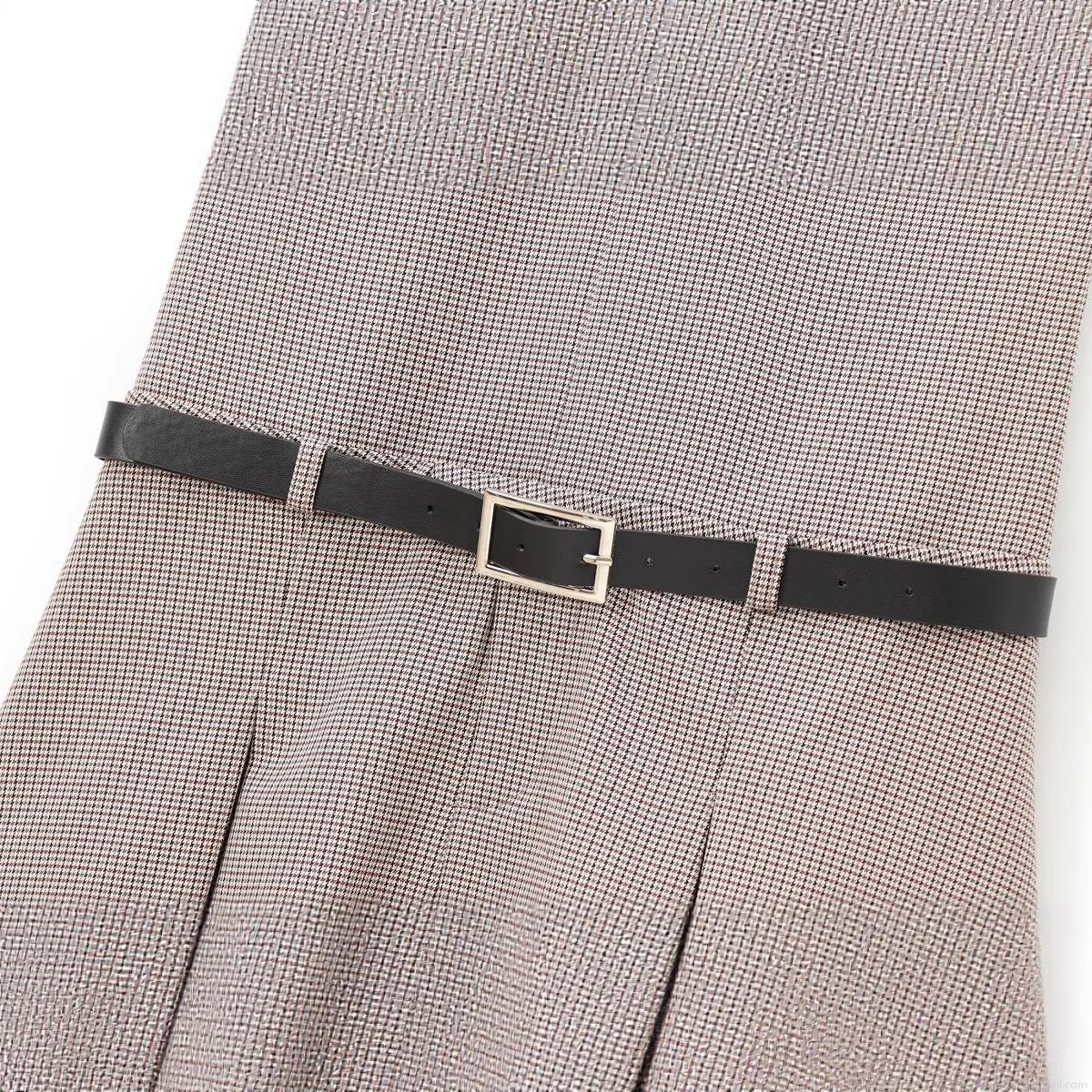 Houndstooth, V-neck, Metal Square Buckle, Invisible Zipper, Wide Pleats, Wear A Thin Belt