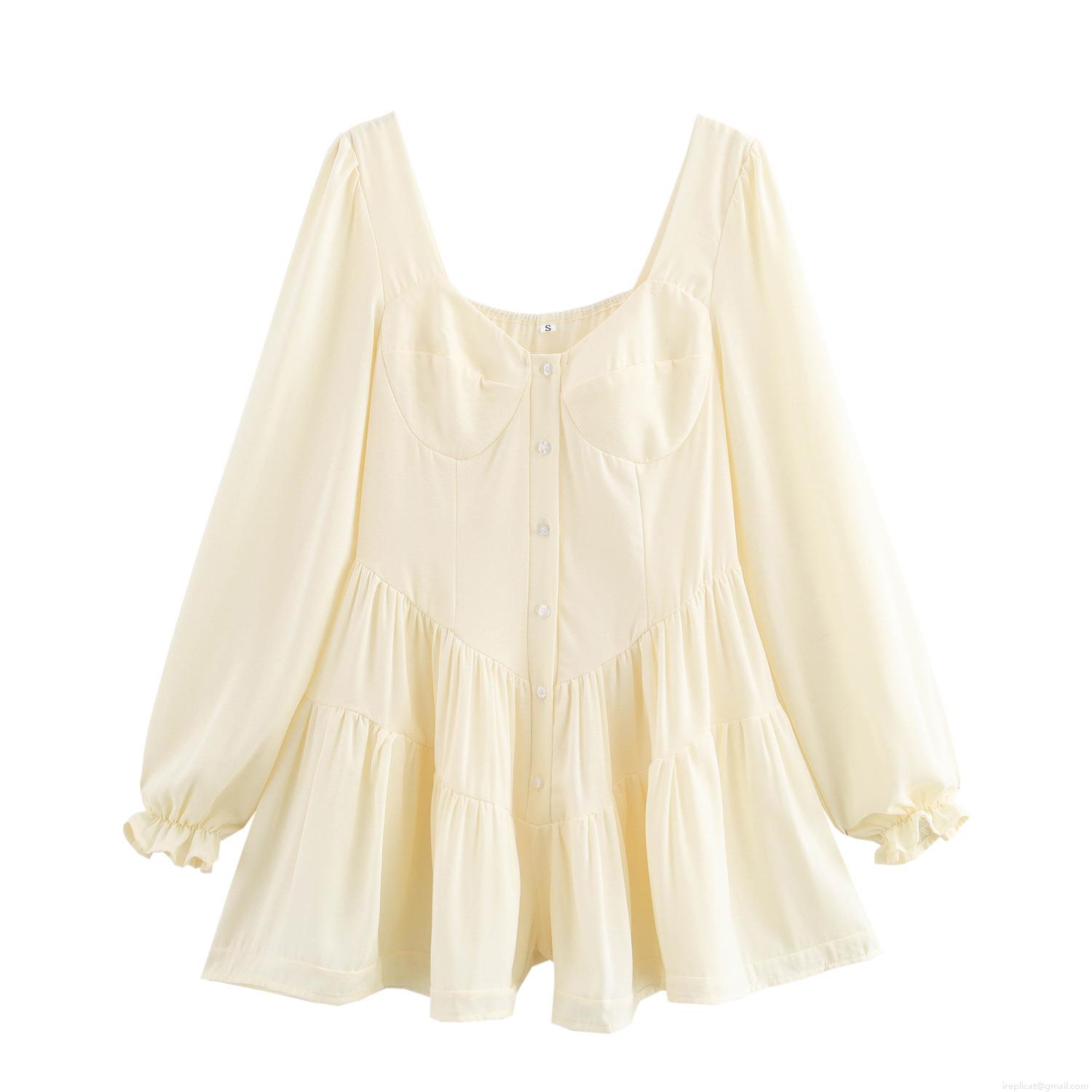 French Style Square Neck Long Sleeve Mini Dress Polyester Solid Color Single Breasted High Waist Tiered Ruffle Dress Women Sweet Elegant Autumn Vacation