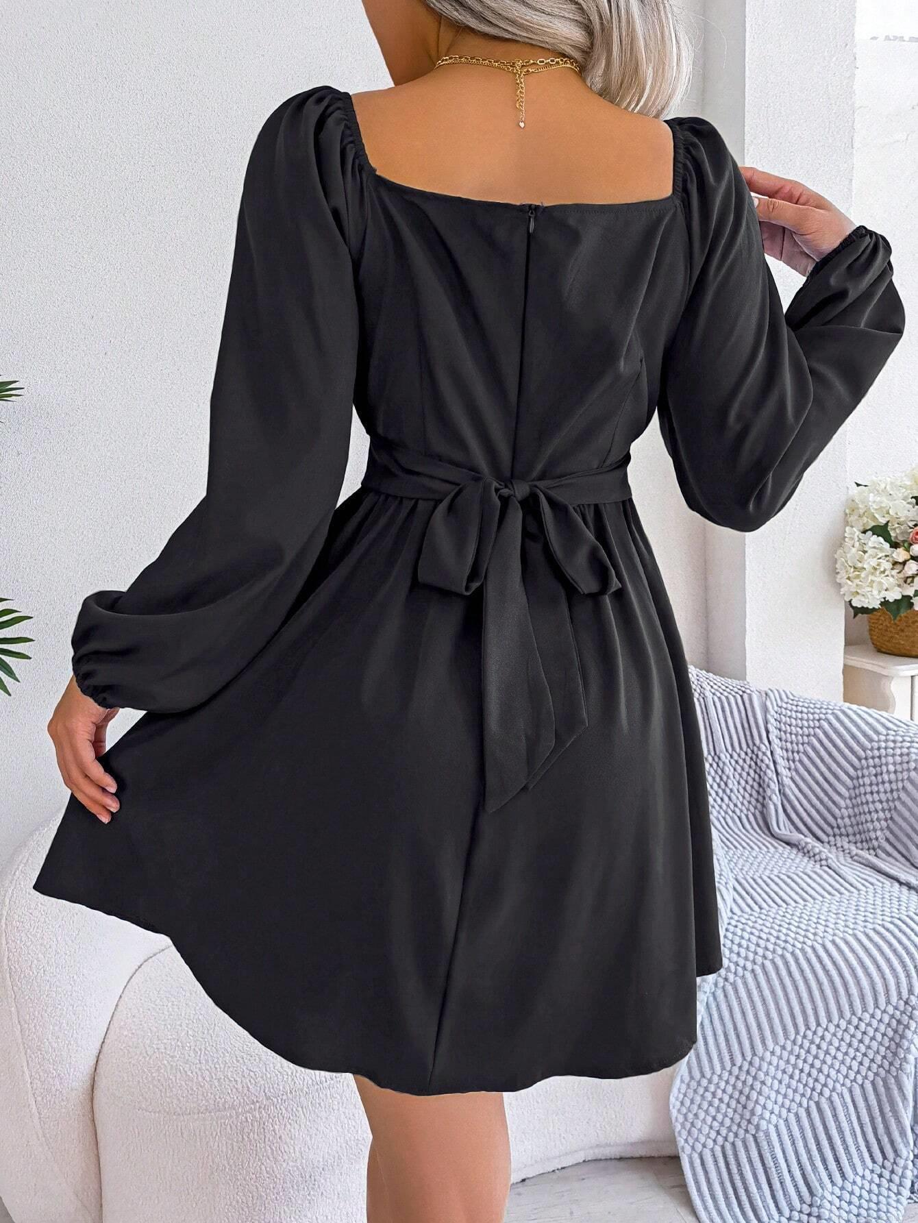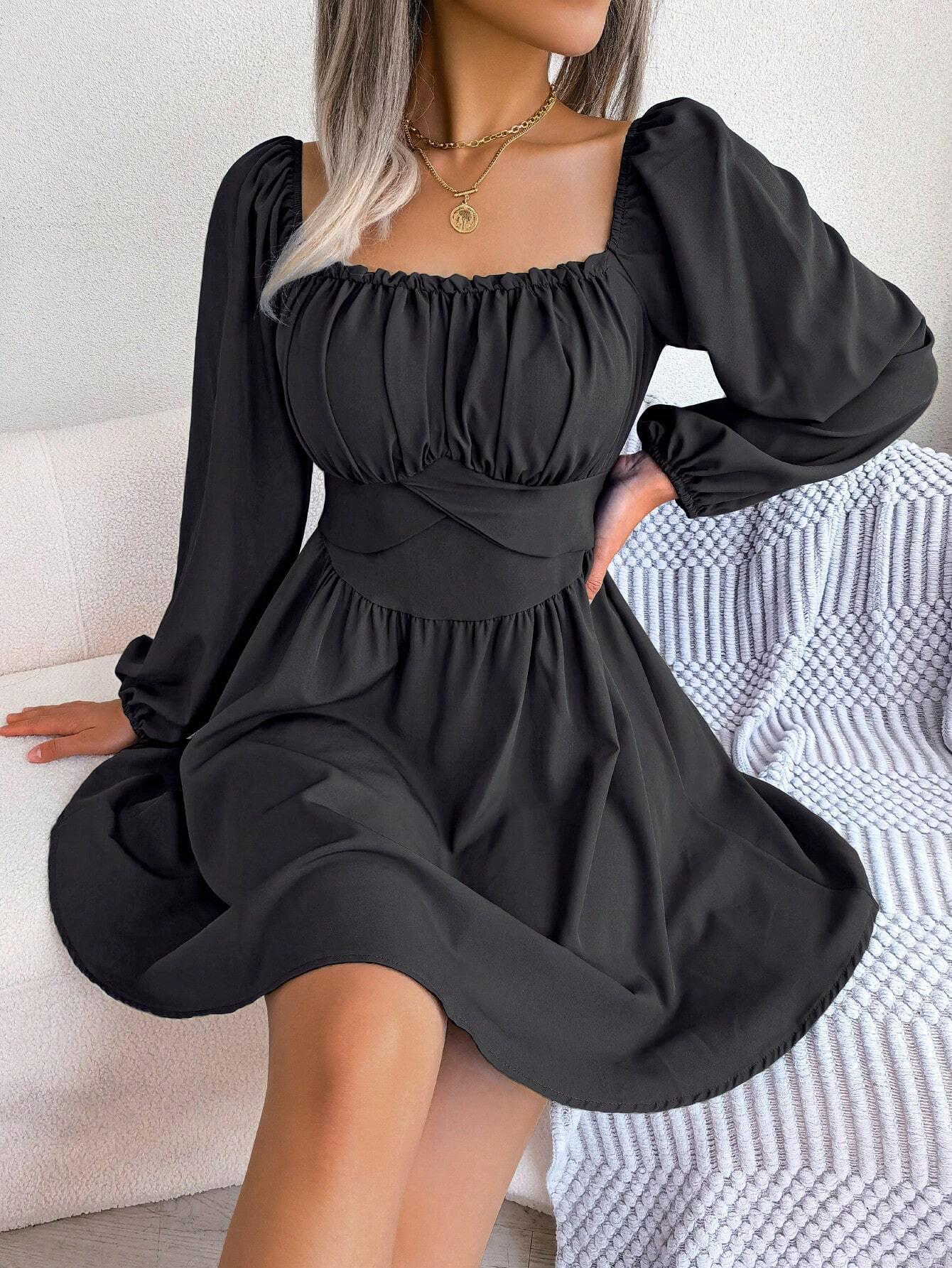 • French Style Square Neck Mini Dress Elegant Long Puff Sleeve Ruched Waist A-Line Black Dress Polyester Spandex Blend Slim Fit Short Dress For Party Office Dating Women Clothing