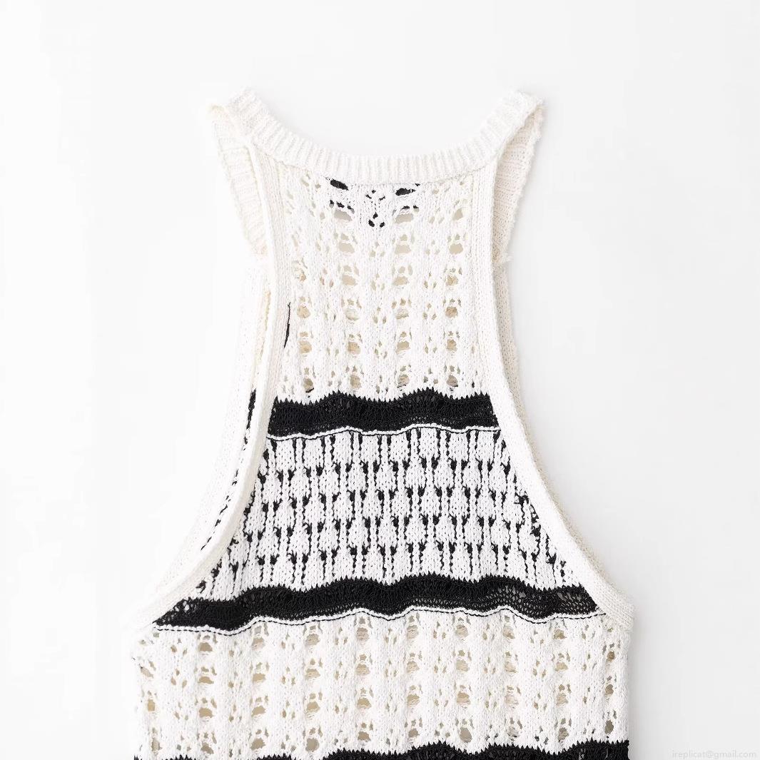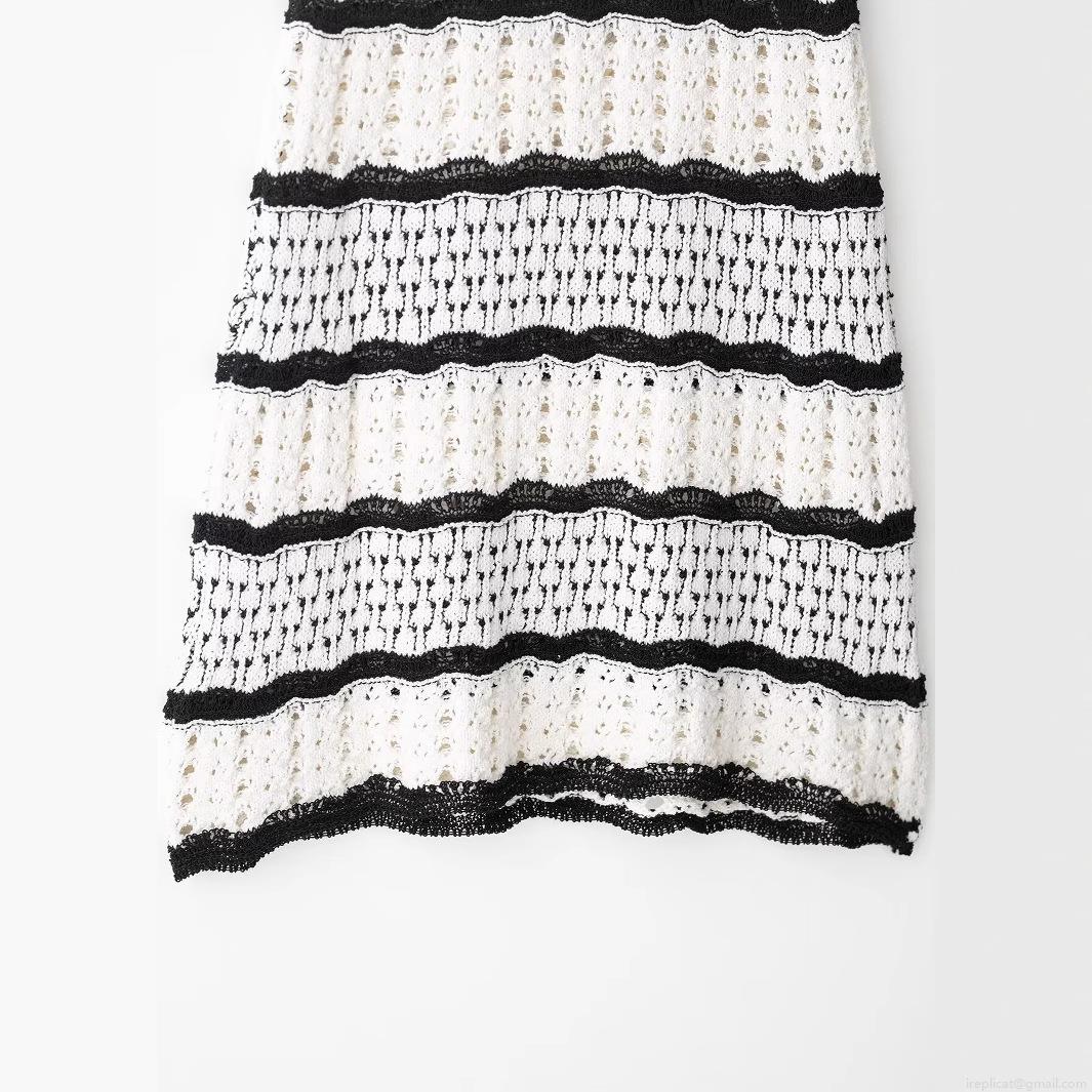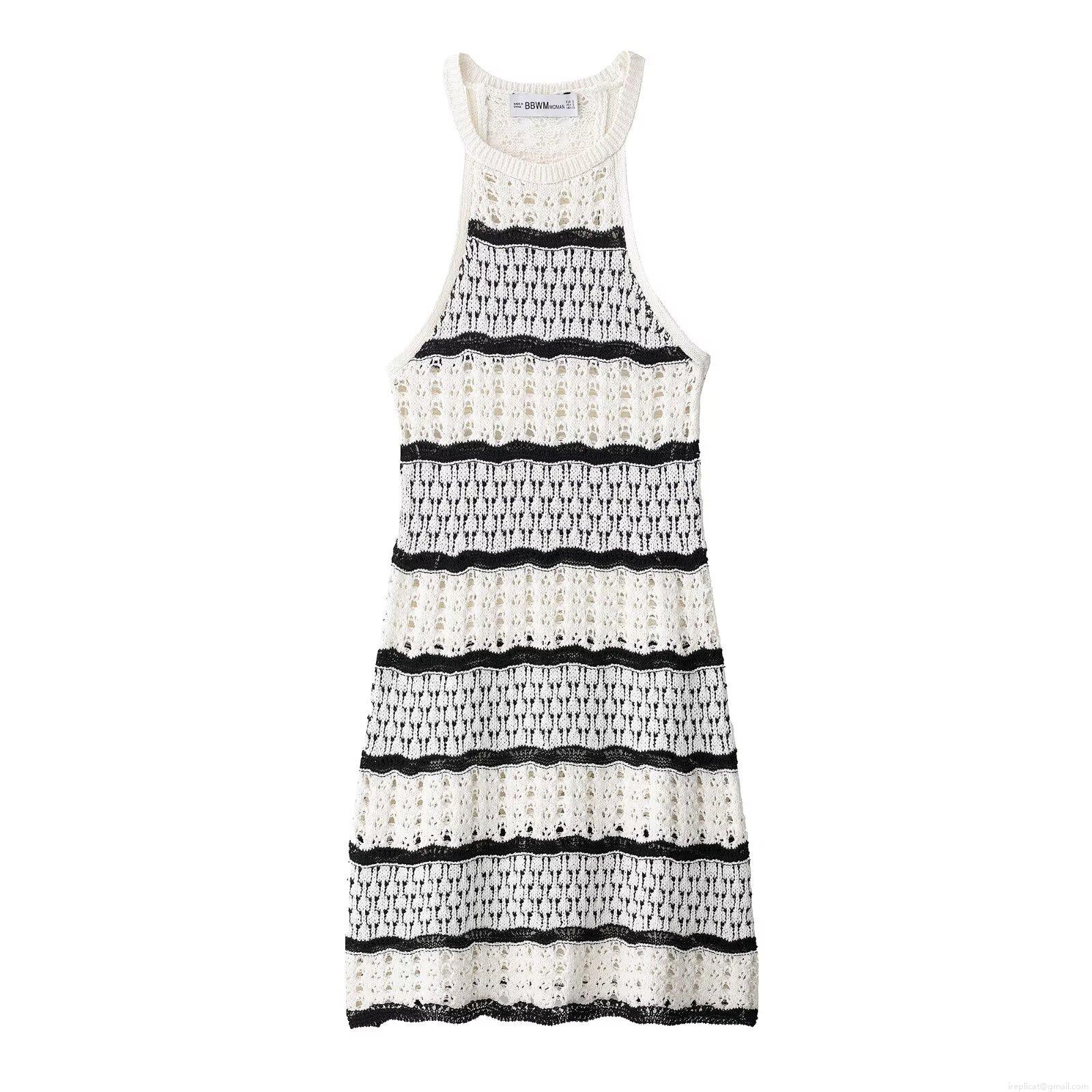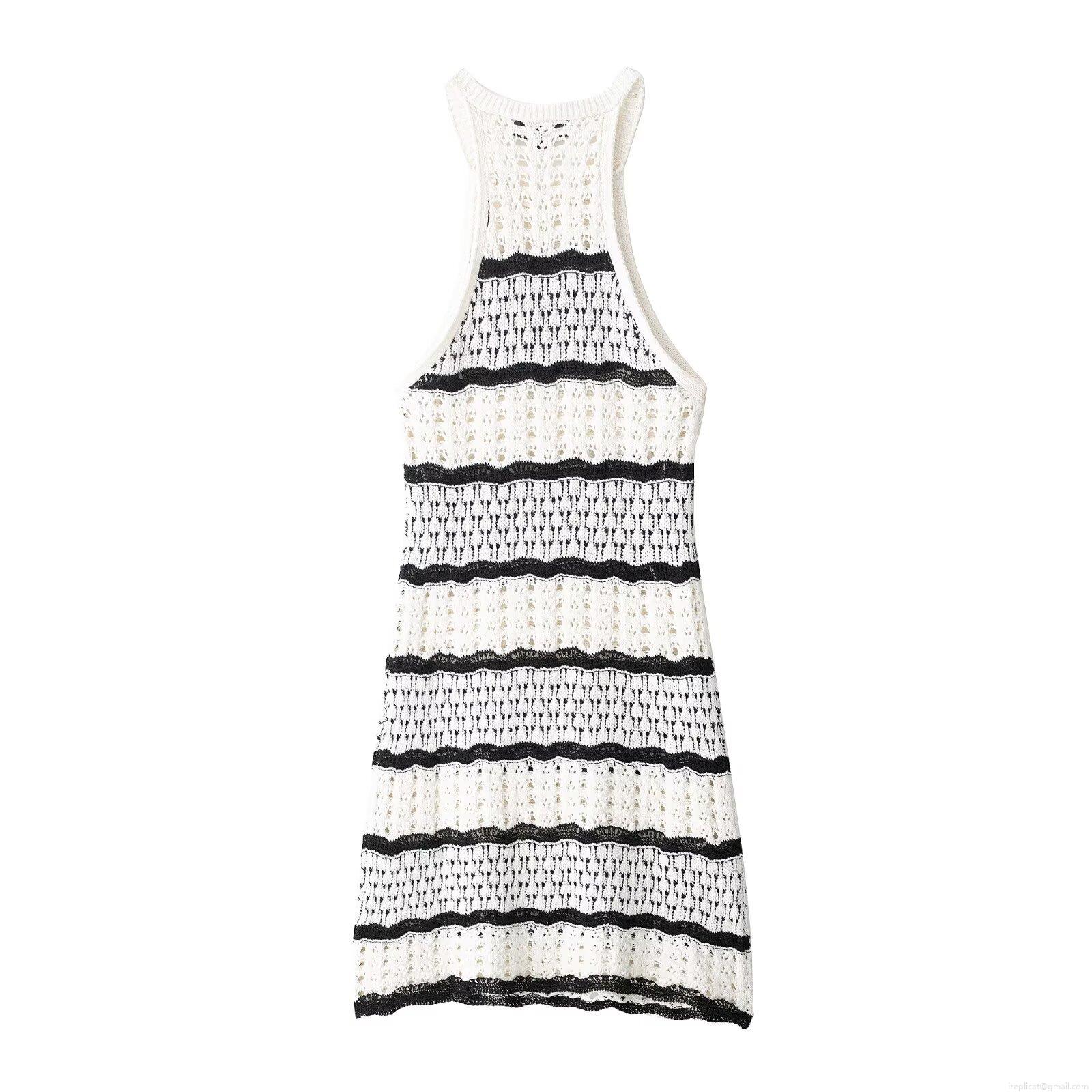 • French Style Striped Knit Halter Dress Women's Sexy Hollow Out Crochet Sleeveless Bodycon Mini Dress For Summer Vacation Party Beach Casual Wear