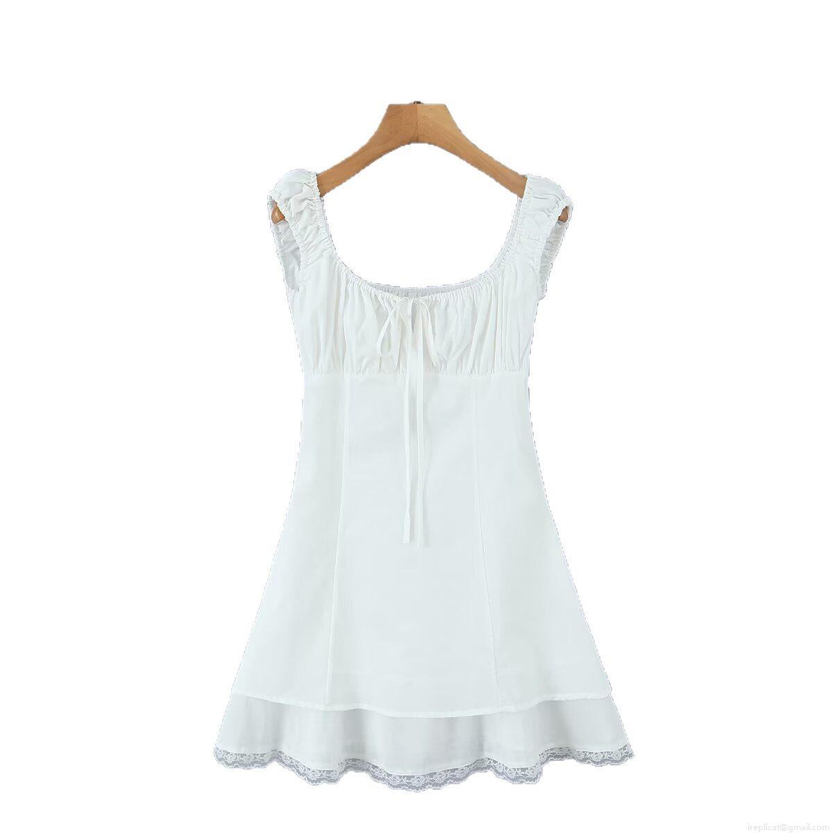 • French Style White Mini Dress For Women Square Neck Short Sleeve Lace Trim Bow Tie-Up A-Line Cotton Dress Elegant Party Vacation Summer Wear