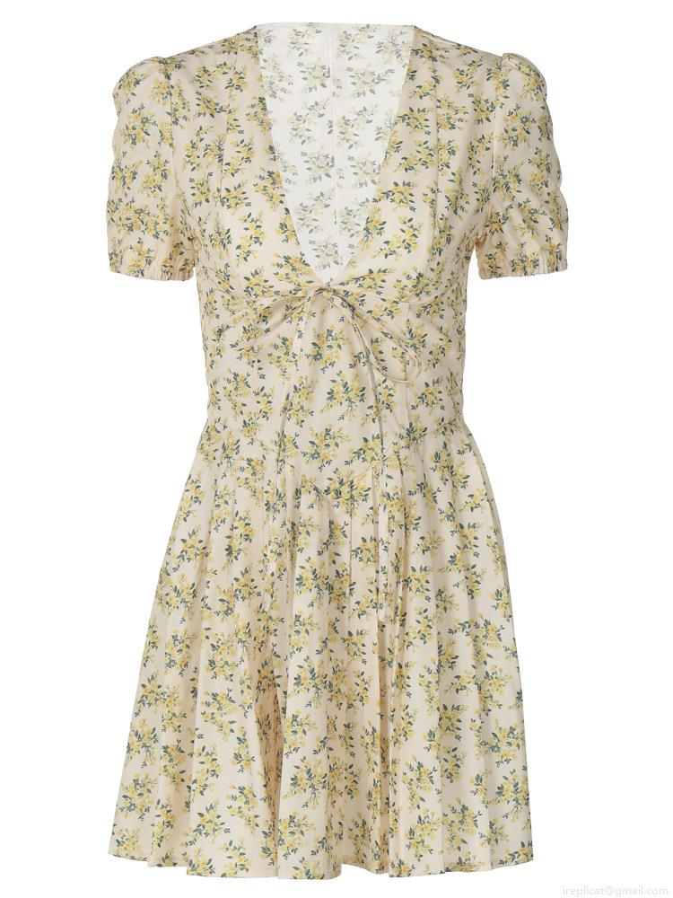 • French Sweet Floral Mini Dress For Women Summer Deep V Neck Puff Sleeve Slim Fit Pleated A-Line Dress Polyester Cotton Blend Casual Beach Party Dress