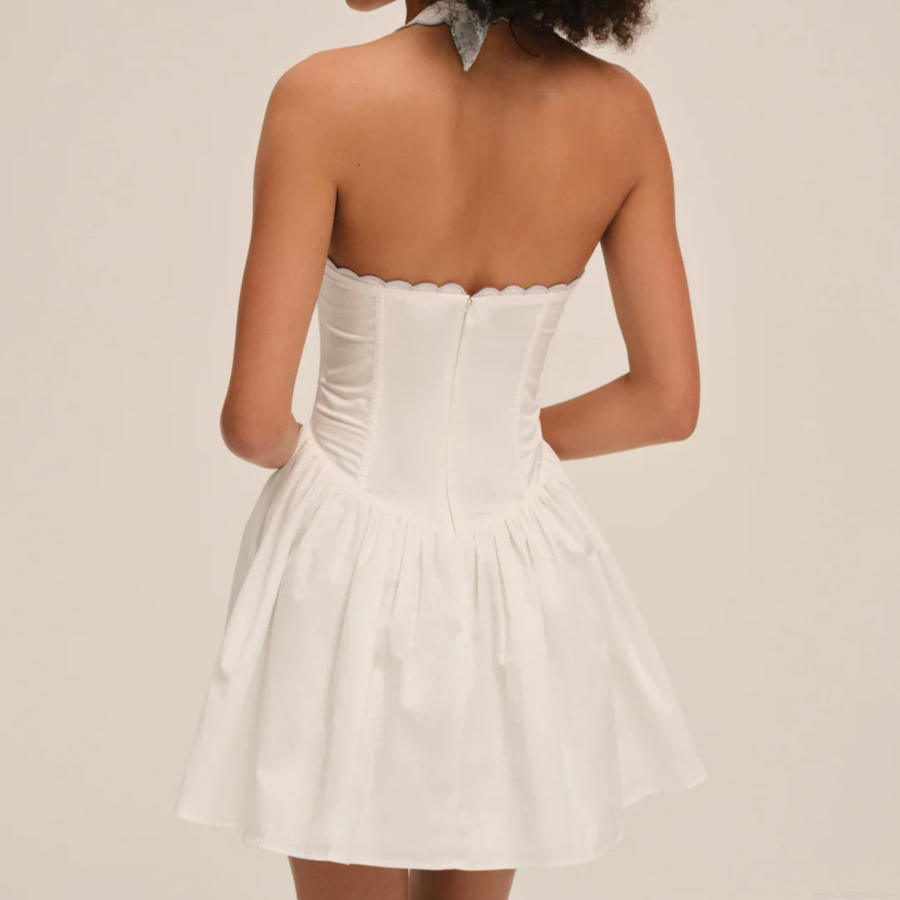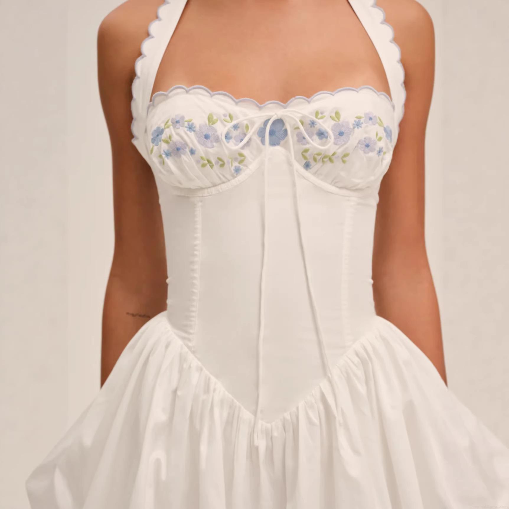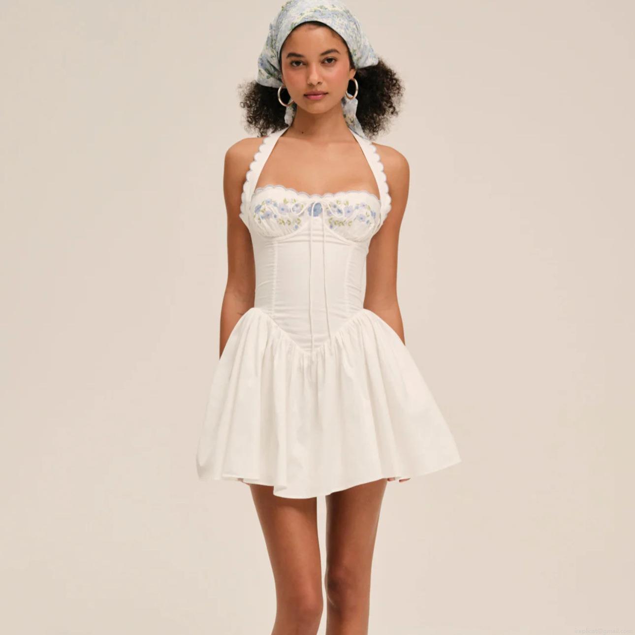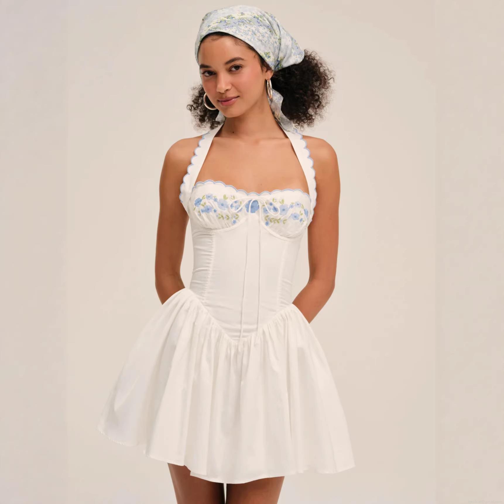 French Sweet White Halter Mini Dress Blue Floral Embroidery Backless Pleated A-Line Polyester Dress For Women Party Wedding Elegant Chic Summer Outfits