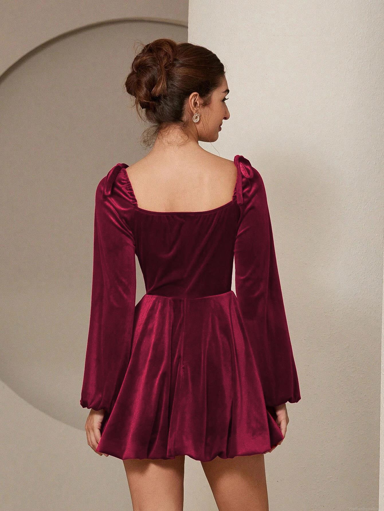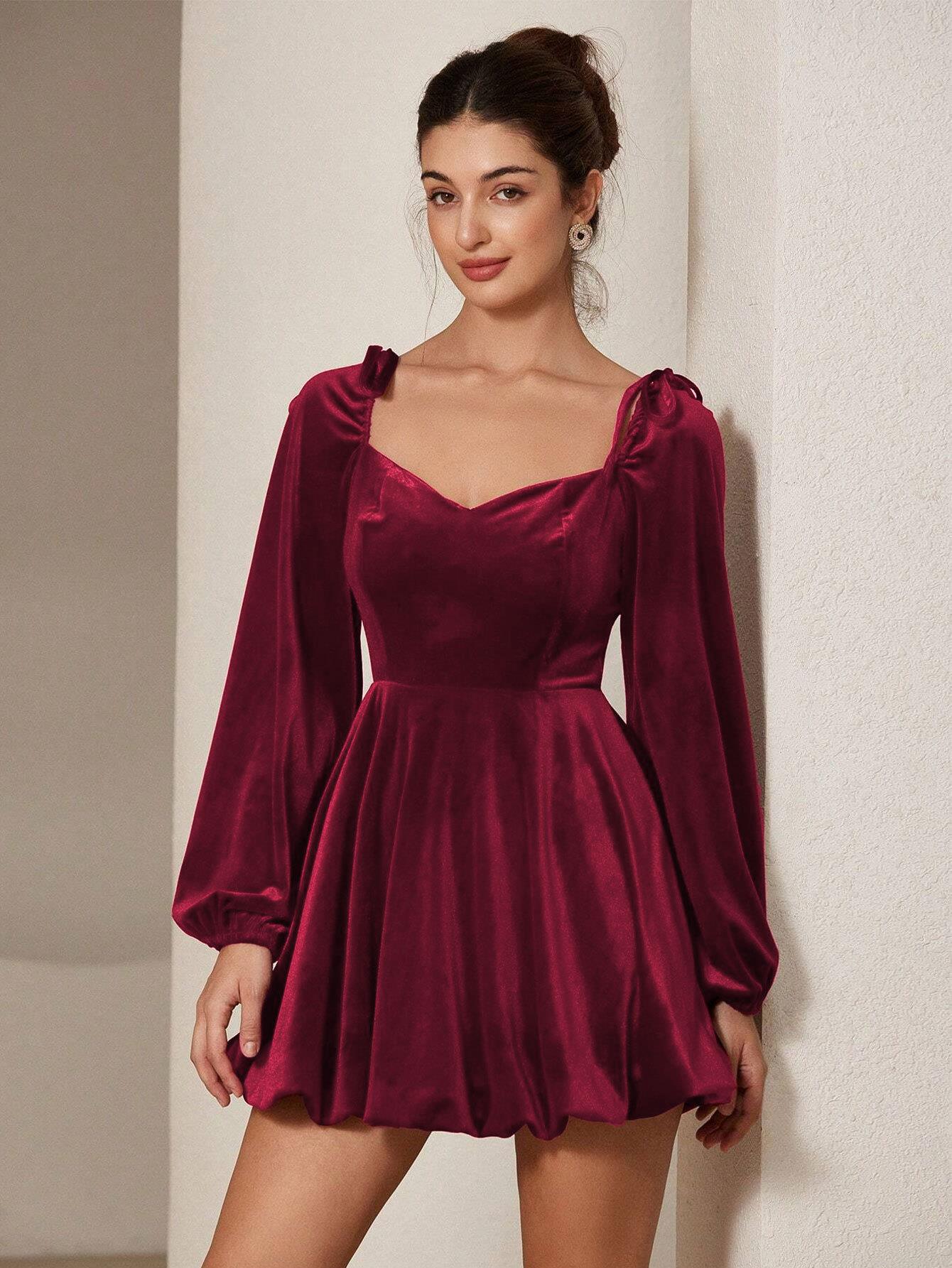 • French Vintage Burgundy Velvet Mini Dress Women Elegant Sweetheart Neck Long Puff Sleeve High Waist Slim Fit Party Cocktail Dress