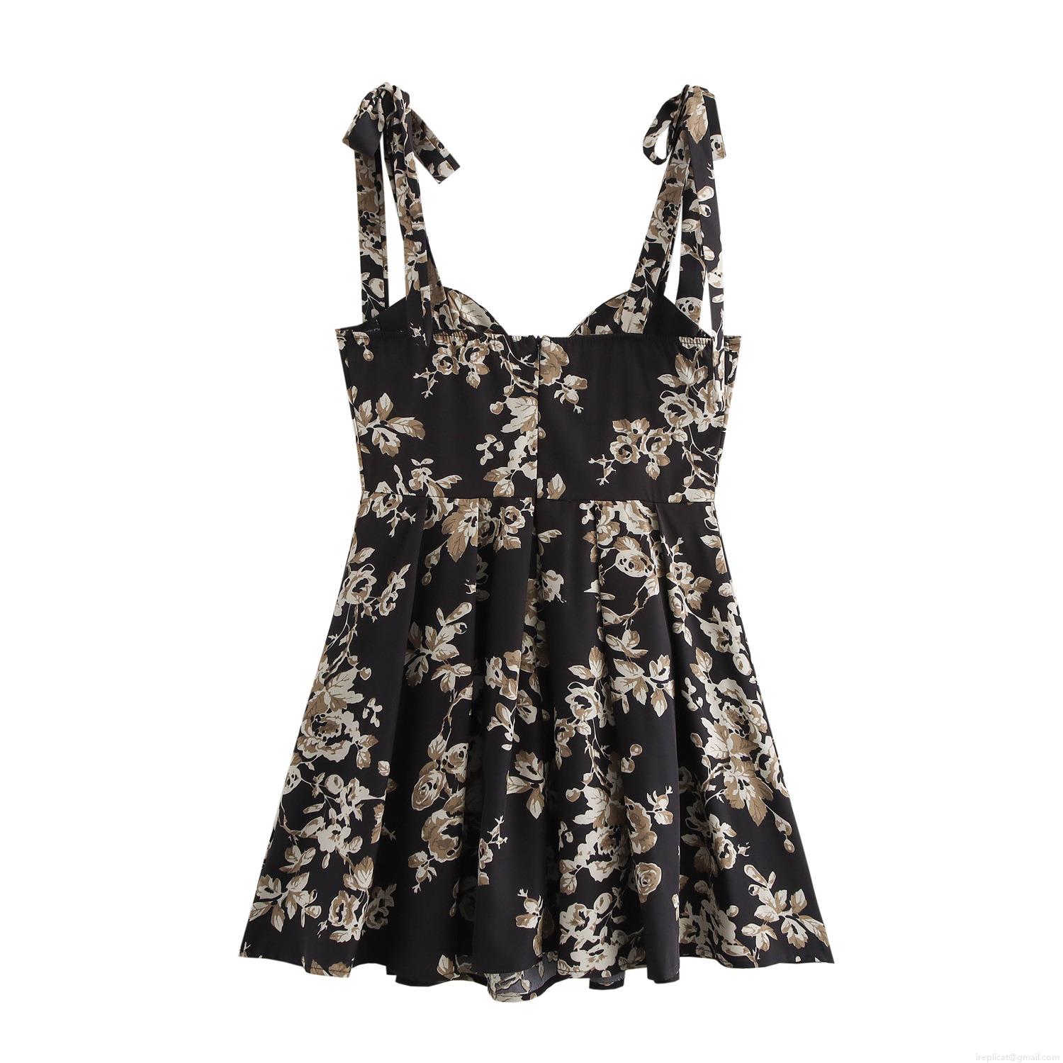 • French Vintage Floral Print Camisole Dress Sleeveless High Waist Pleated Mini Dress With Adjustable Bow Shoulder Straps For Women Summer Elegant A-Line Short Sundress