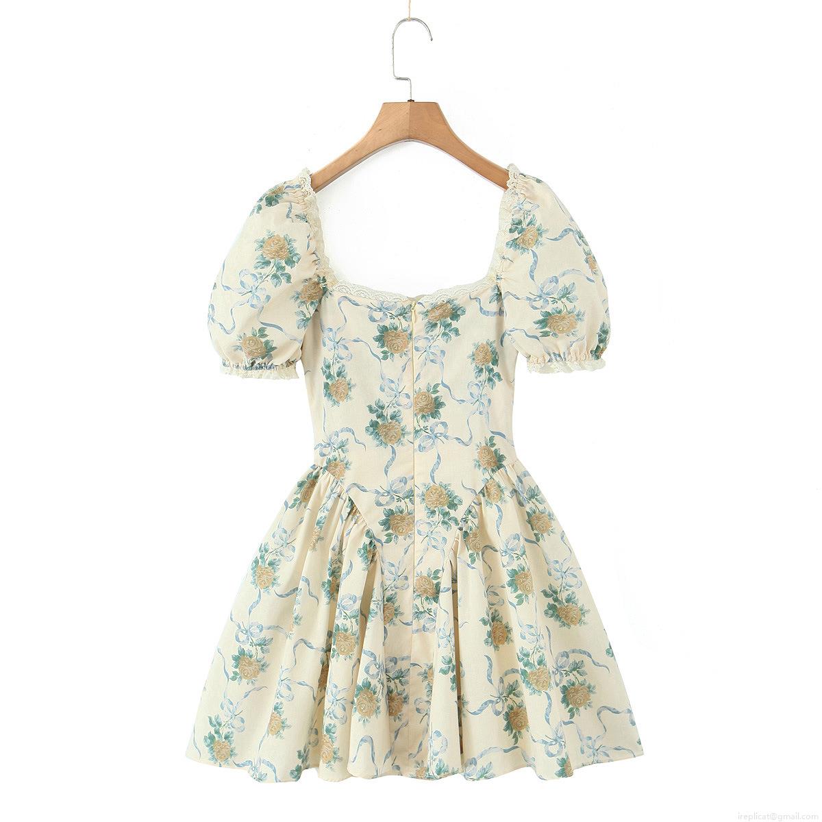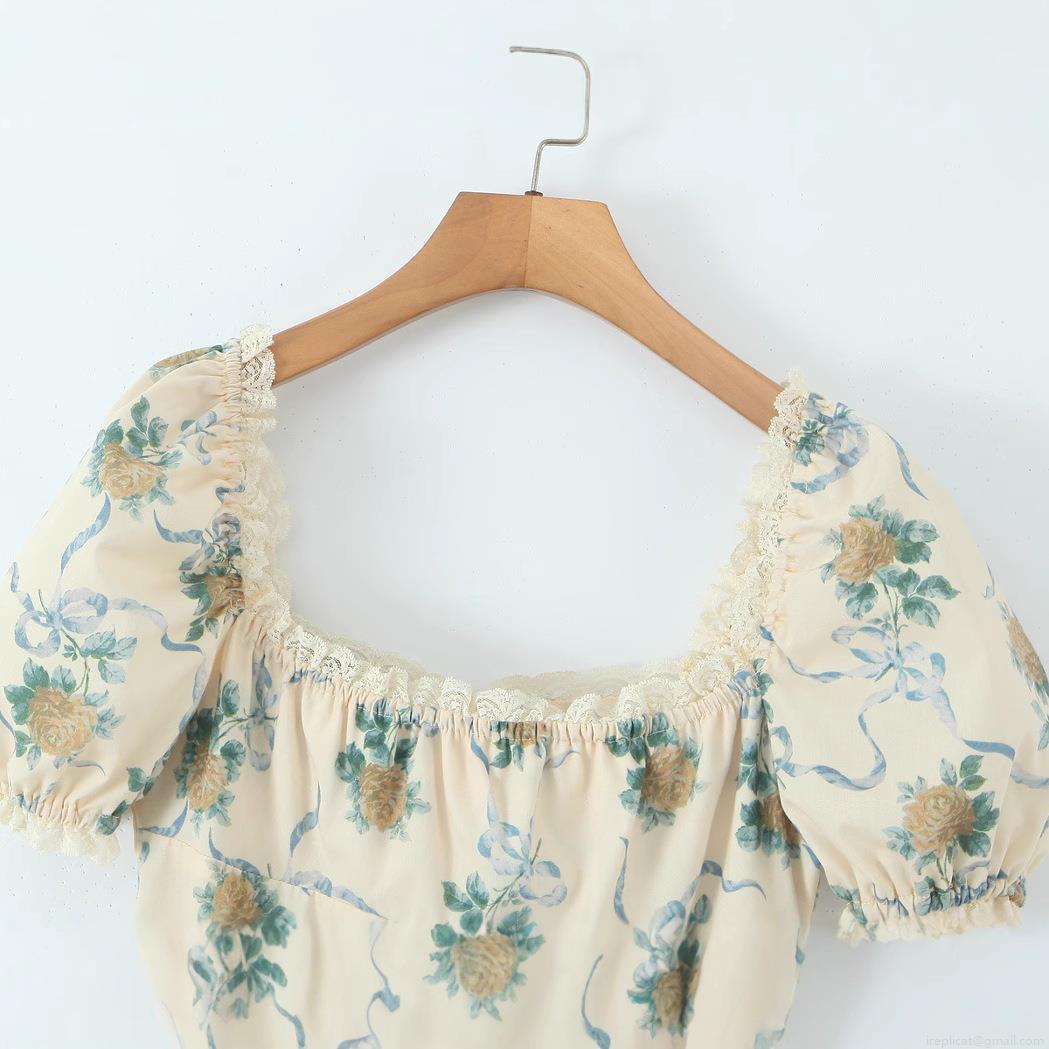 French Vintage Floral Print Mini Dress Women Cotton Blend Square Neck Lace Trim Puff Sleeve A-Line Short Dress Summer Casual Daily Vacation Dress